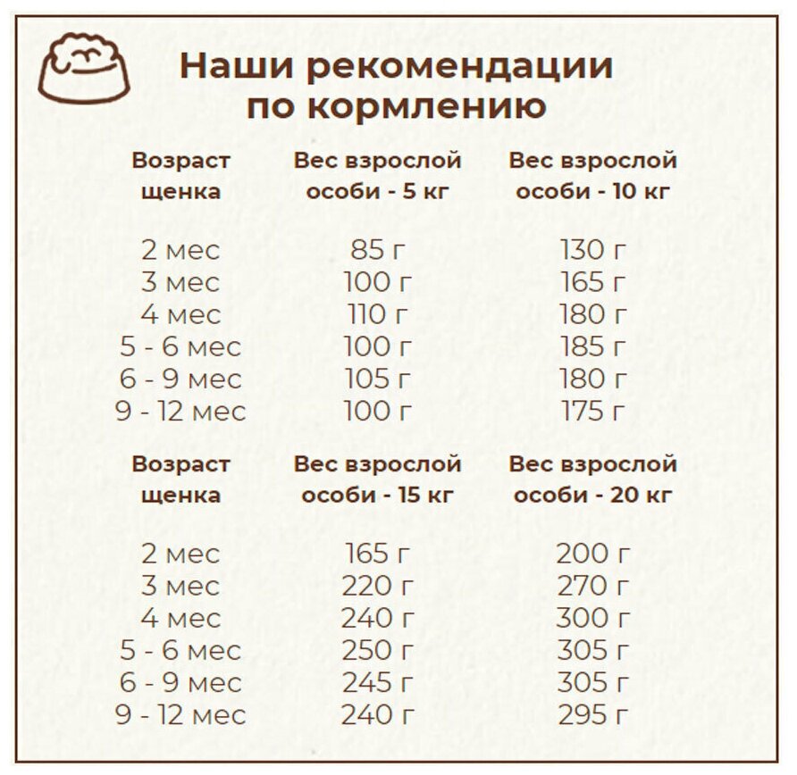 Рекомендации по кормлению щенка сухим кормом в зависимости от веса взрослой собаки (грамм в день):