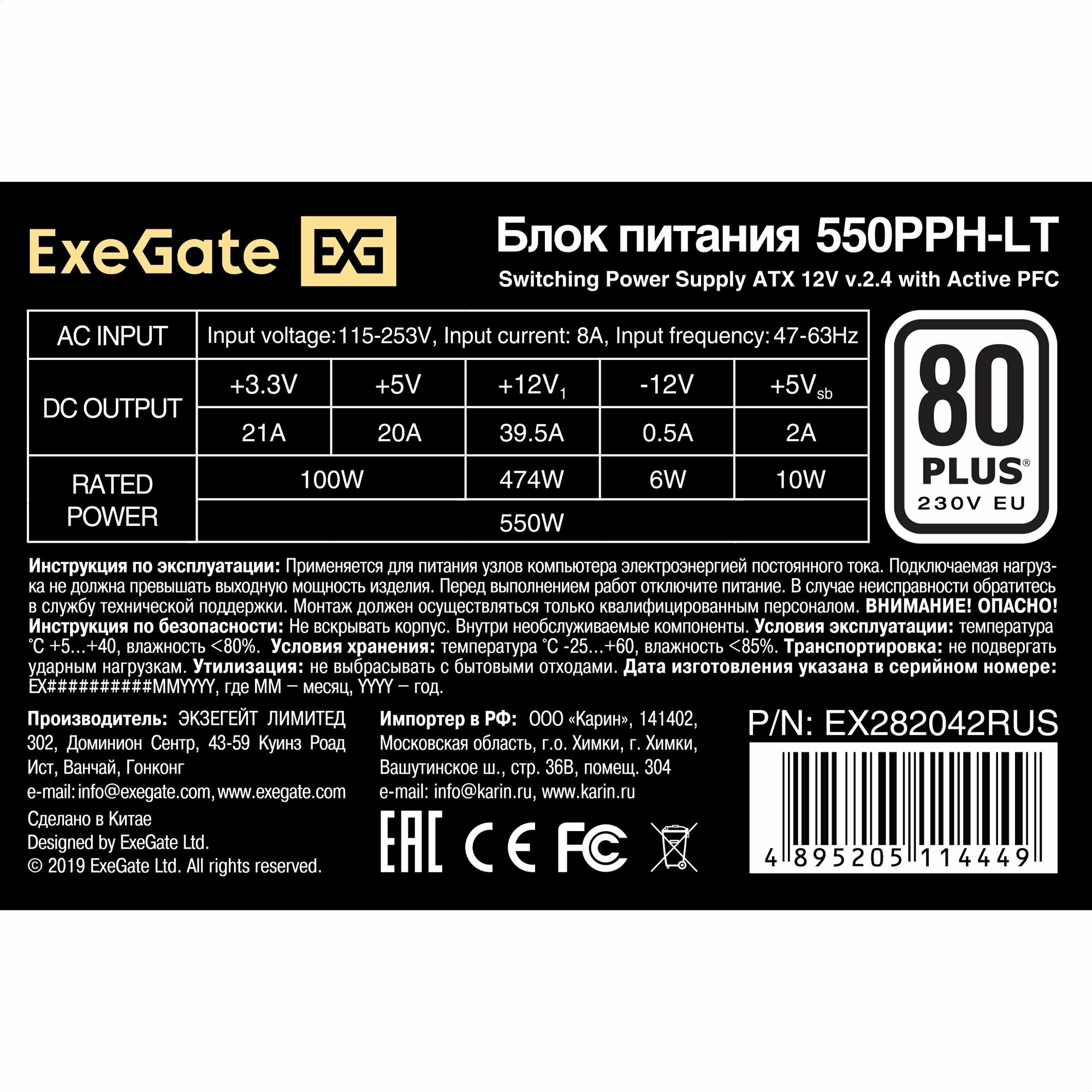 Блок питания ATX 550 Вт Exegate 550PPH-LT EX282042RUS