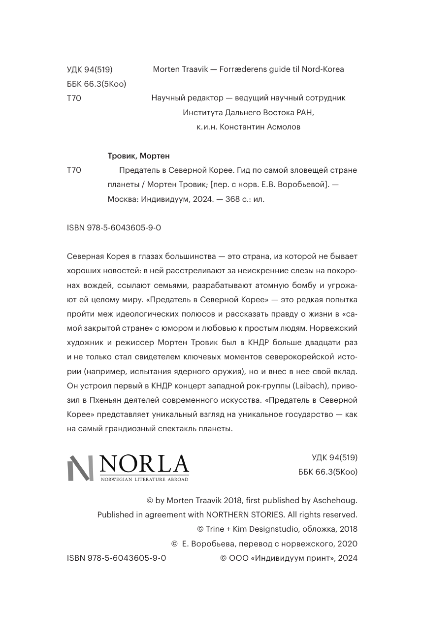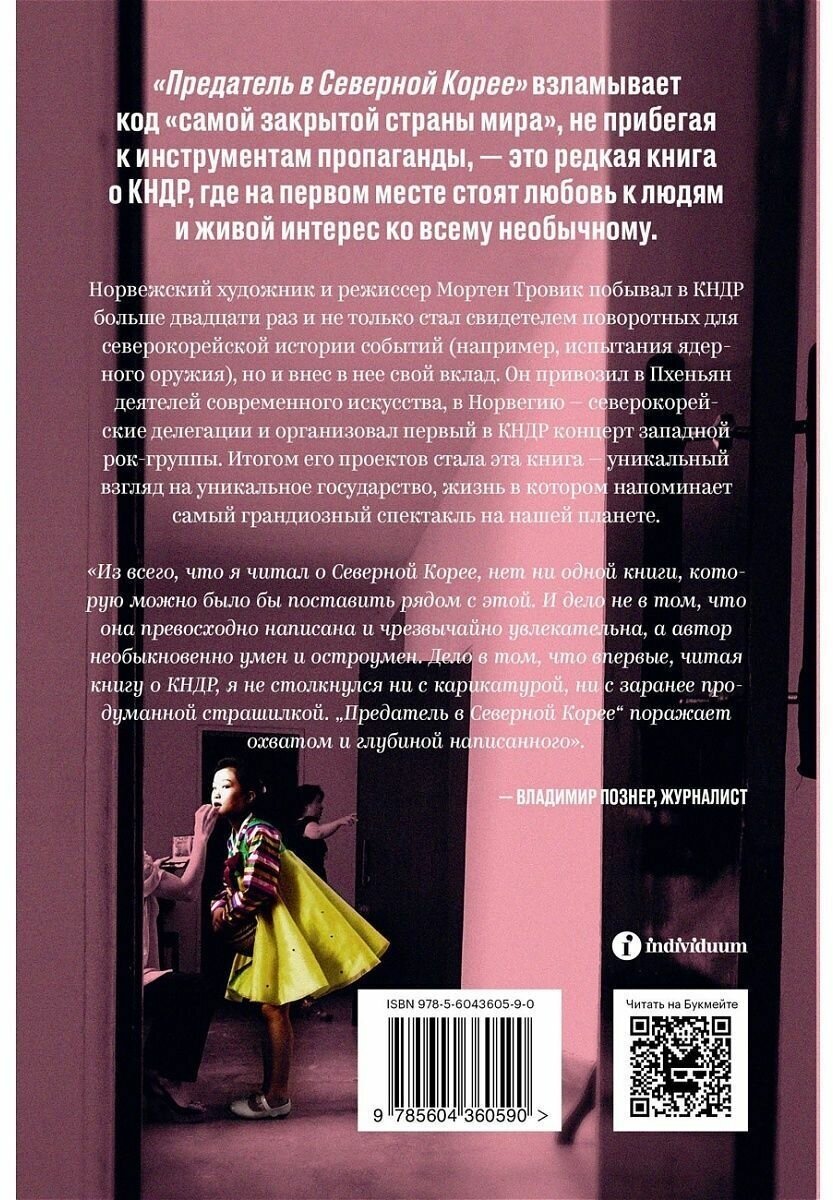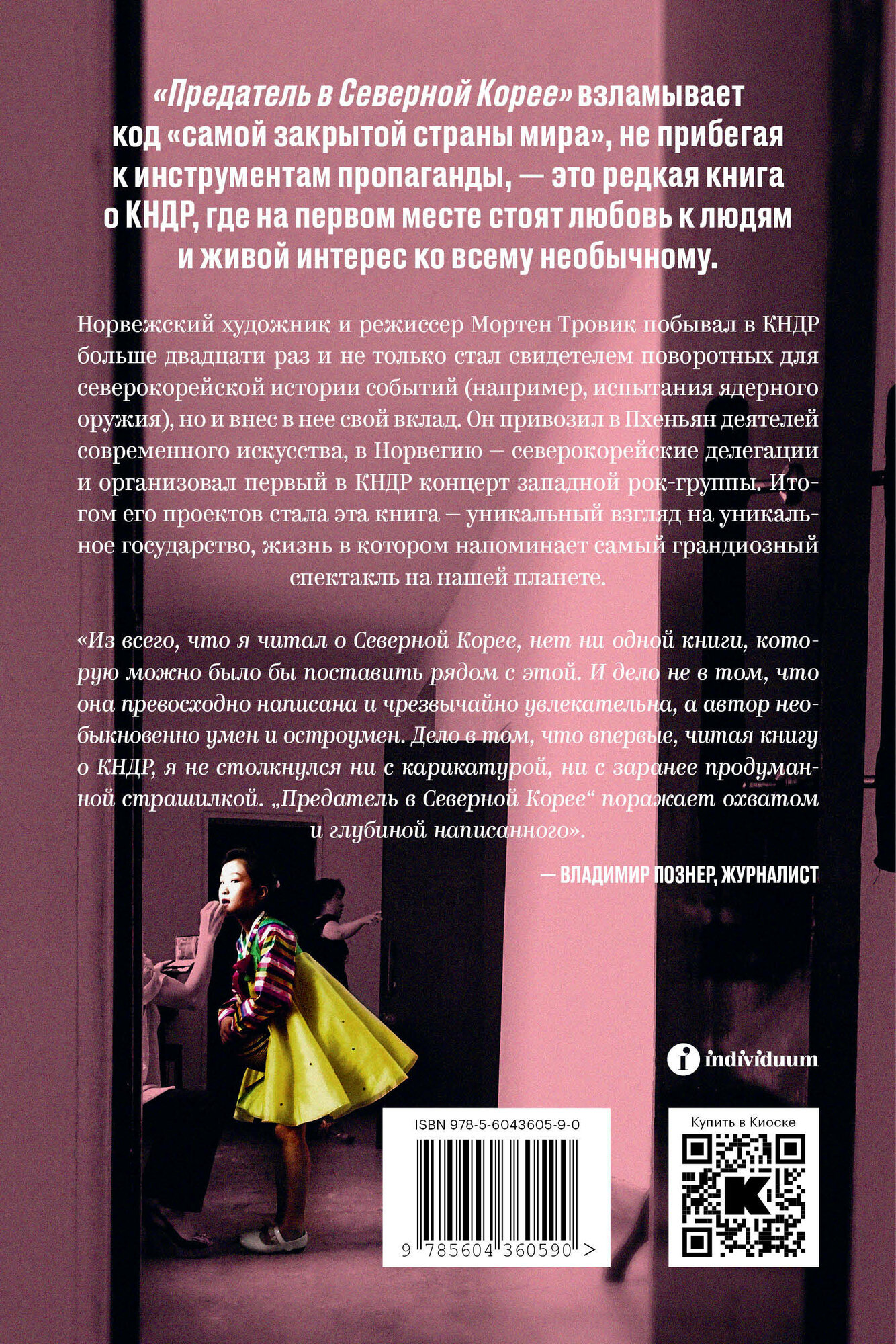Северная Корея в глазах большинства - это страна, из которой не бывает хороших новостей: в ней расстреливают за неискренние слезы на похоронах вождей, ссылают семьями, разрабатывают атомную бомбу и угрожают ей целому миру. "Предатель в Северной Корее" - это редкая попытка пройти меж идеологических полюсов и рассказать правду о жизни в "самой закрытой стране" с юмором и любовью к простым людям. Норвежский художник и режиссер Мортен Тровик был в КНДР больше двадцати раз и не только стал свидетелем ключевых моментов северокорейской истории (например, испытания ядерного оружия), но и внес в нее свой вклад. Он устроил первый в КНДР концерт западной рок-группы (Laibach), привозил в Пхеньян деятелей современного искусства. "Предатель в Северной Корее" представляет уникальный взгляд на уникальное государство - как на самый грандиозный спектакль планеты.