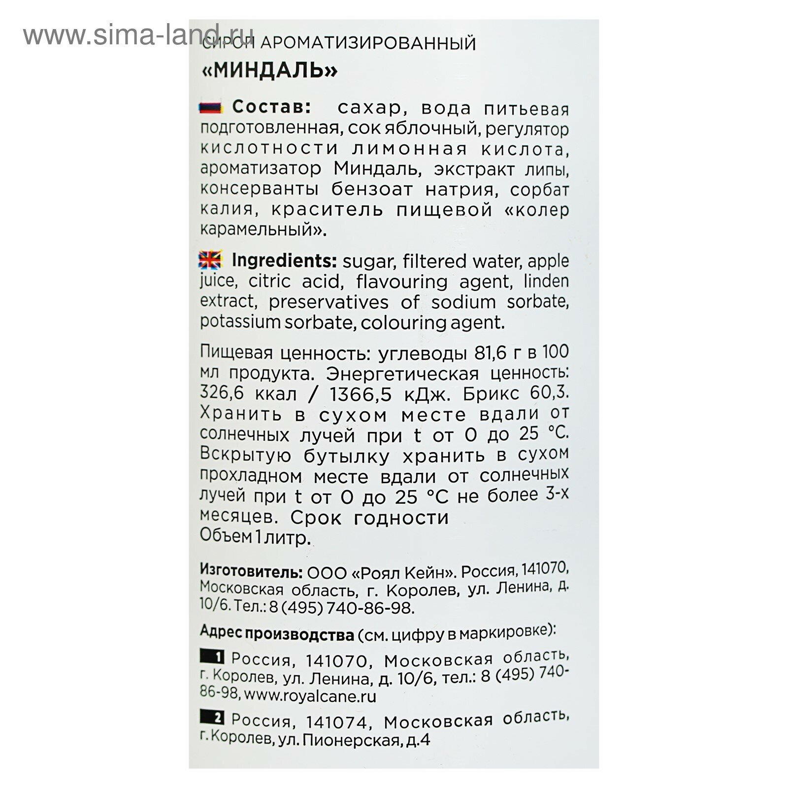 | Состав | сахар, вода питьевая подготовленная, сок яблочный, регулятор кислотности лимонная кислота (Е330), ароматизатор Миндаль, экстракт липы, консерванты бензоат натрия (Е211), сорбат калия (Е202), краситель пищевой «колер карамельный» (E150d) |