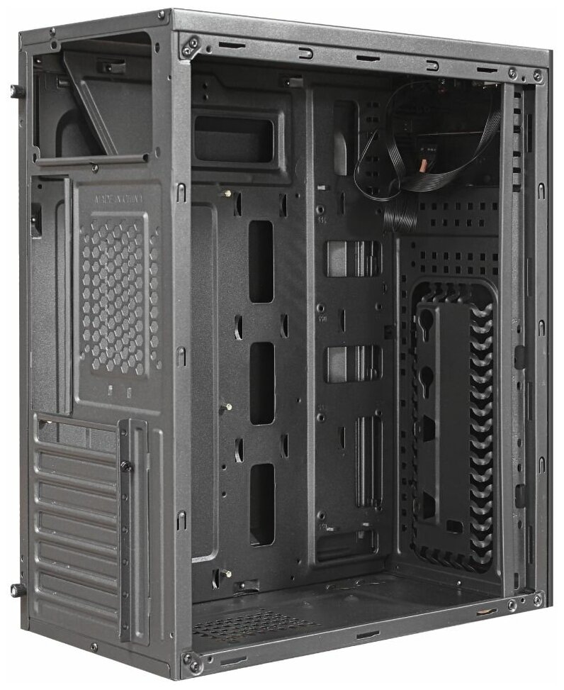 Корпус Ginzzu A200 выполнен из стали 0,45 мм в черном цвете. Он имеет отличную жесткость конструкции за счет 2-ной клепки узловых соединений с фигурным теснением. Наличие кабельных каналов дает возможность аккуратно проложить провода питания элементов ПК. Такая укладка придает элегантный вид собранного компьютера, обеспечивает беспрепятственный доступ воздуха к компонентам системы для ее качественного охлаждения.