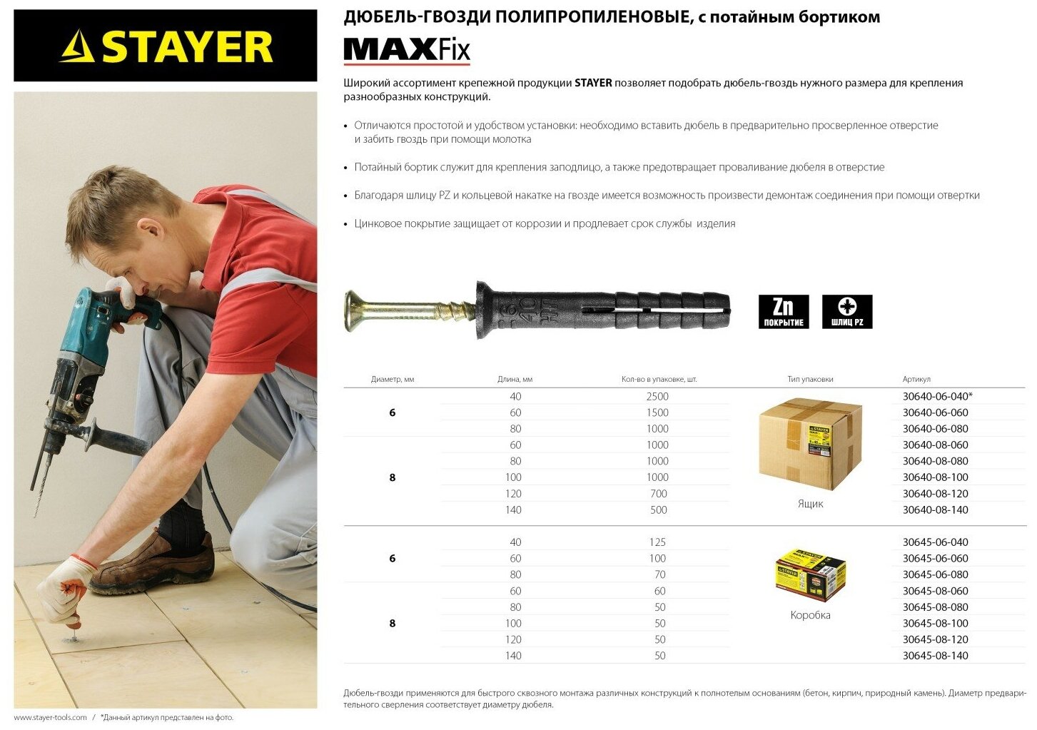 Дюбель-гвоздь STAYER "MASTER" полипропиленовый, потайный бортик. Отличается простотой и удобством установки: необходимо вставить дюбель в предварительно просверленное отверстие и забить гвоздь при помощи молотка Потайный бортик служит для крепления заподлицо, а также предотвращает проваливание дюбеля в отверстие. Благодаря шлицу PZ и кольцевой накатке на гвозде имеется возможность произвести демонтаж соединения при помощи отвертки