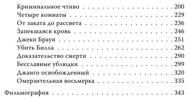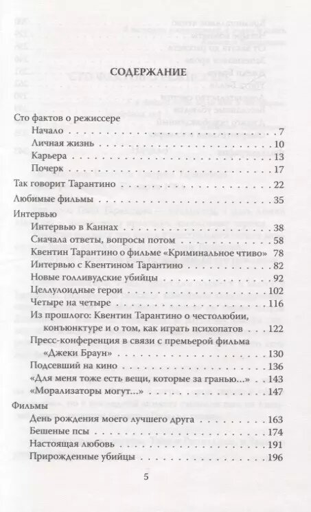 По содержанию, эту несколько довольно известных интервью Тарантино, в которых муссируются одни и те же слова и мысли на протяжении 352 страниц. Какая-либо ценная информация заключена всего лишь в 1/4 из всего бумажного объёма. У самого есть такая-же, но с другой обложкой - крупный шрифт и, вследствие этого, большое количество страниц пытаются скрыть от читателя реальное отсутствие информации.