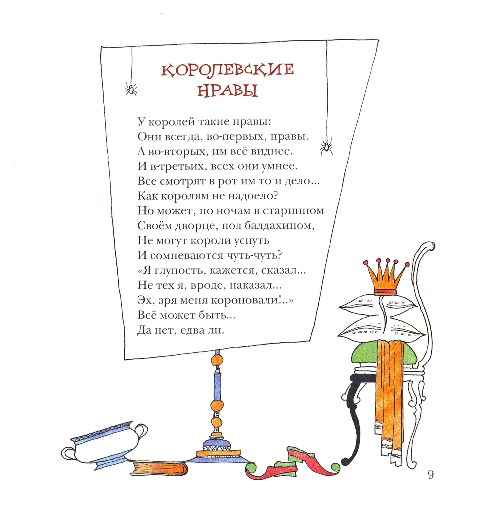 Для нас эта книга – первый опыт знакомства с новым автором, и этот опыт удался. «Короли и фасоль» - детские стихи, веселые и поучительные одновременно. Но это еще и сатира. За волшебным миром принцев и королей, валетов и дам узнаются обычные люди с их привычками и слабостями. Читать книгу интересно. Книга издана на меловке. И иллюстрации очень необычные. Выкладываю особенно понравившиеся и мне, и ребенку.