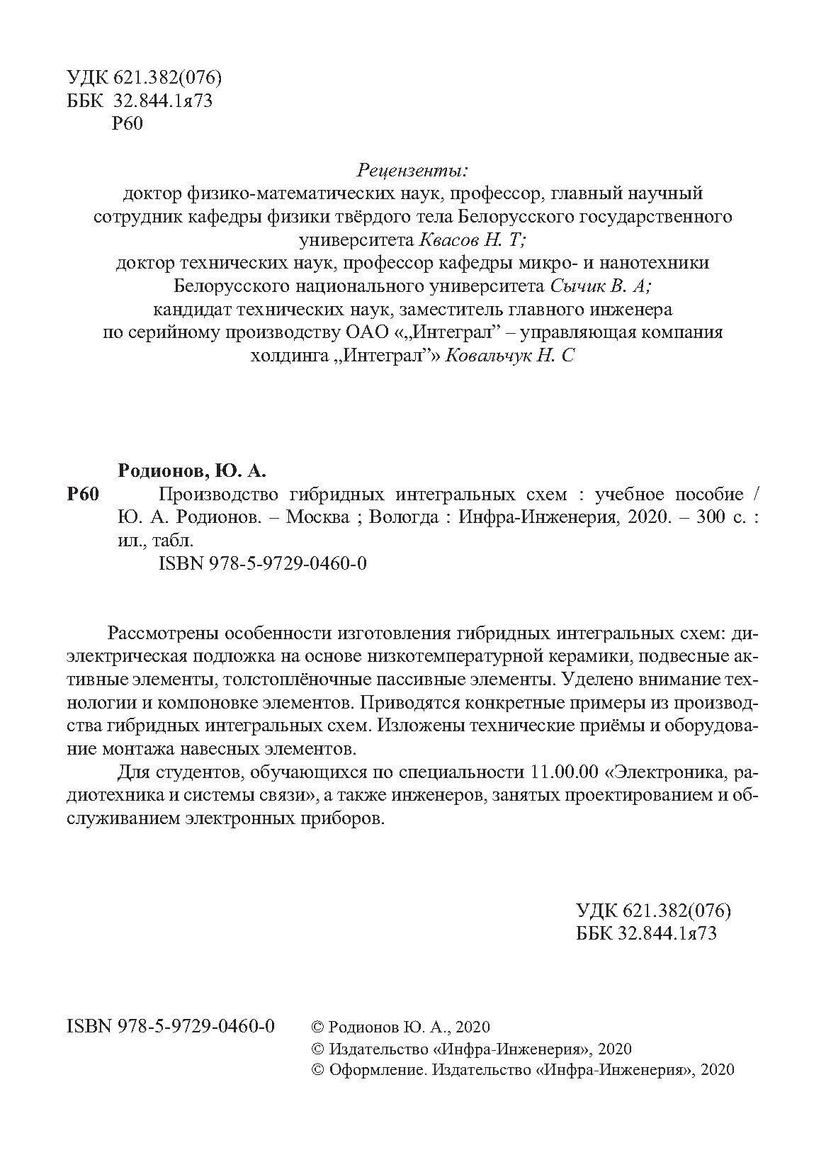 Производство гибридных интегральных схем. Учебное пособие (Ю. А. Родионов); Инфра-Инженерия, 2020