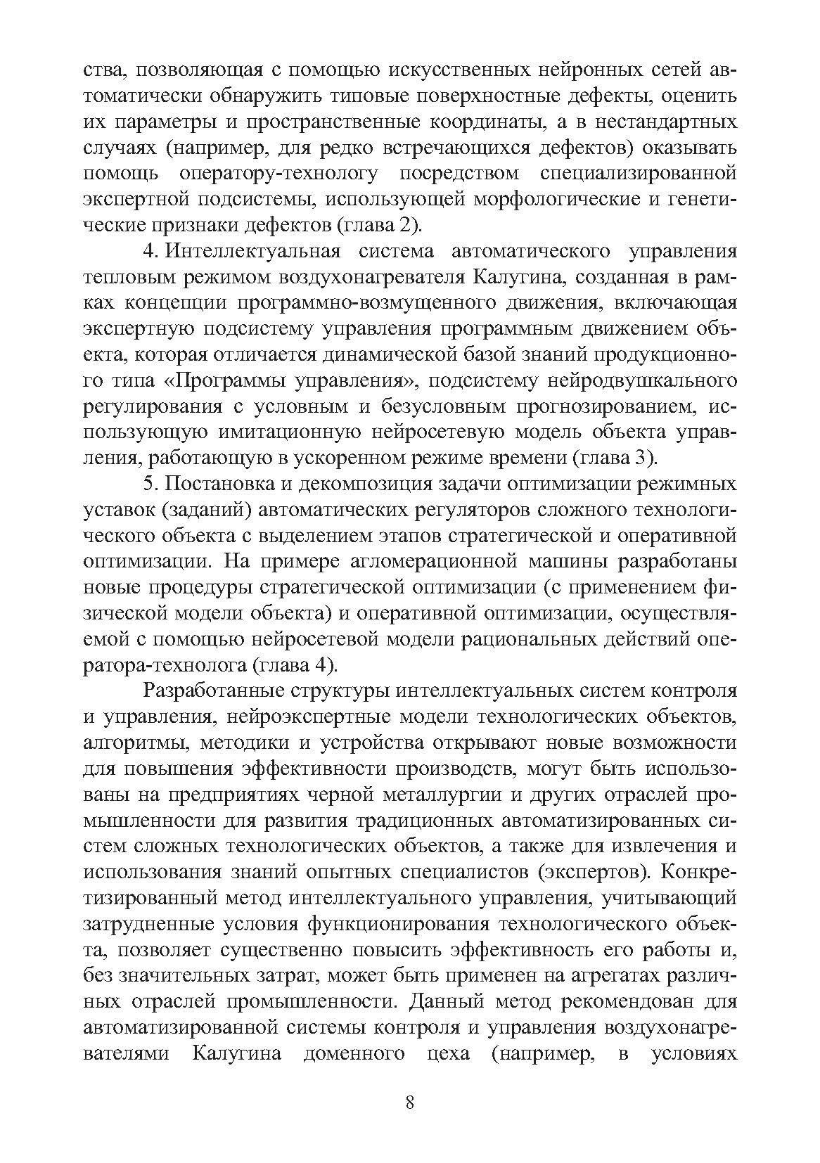 Представлены теоретические и прикладные основы интеллектуальных АСУ применительно к сложным техническим и человеко-техническим объектам. Выполнены анализ, обобщение и развитие концептуальных основ интеллектуальных систем контроля и управления сложными динамическими объектами, разработаны новые нейроэкспертные методы и алгоритмы распознавания, оптимизации, регулирования, создано алгоритмическое и программное обеспечение интеллектуальных систем для решения актуальных задач контроля и управления агрегатами и производственными участками предприятий черной металлургии.