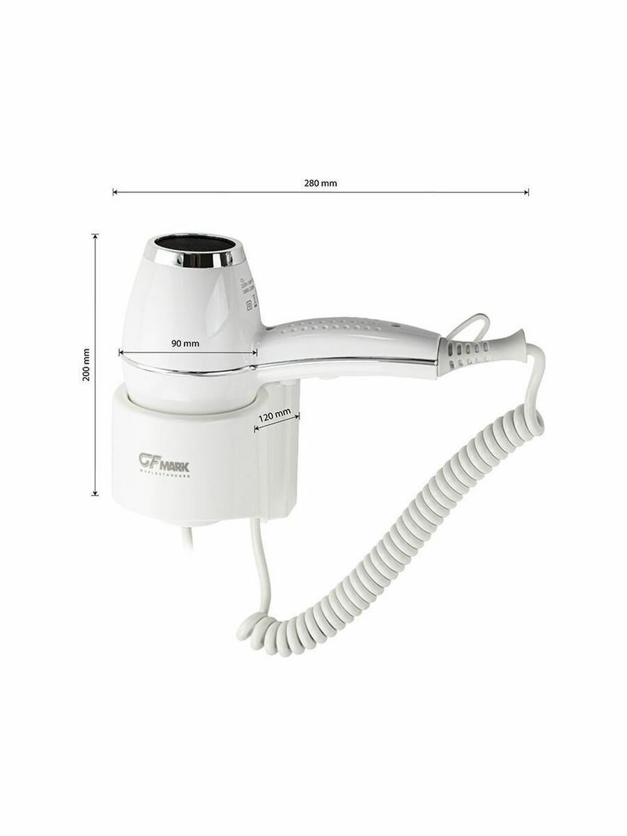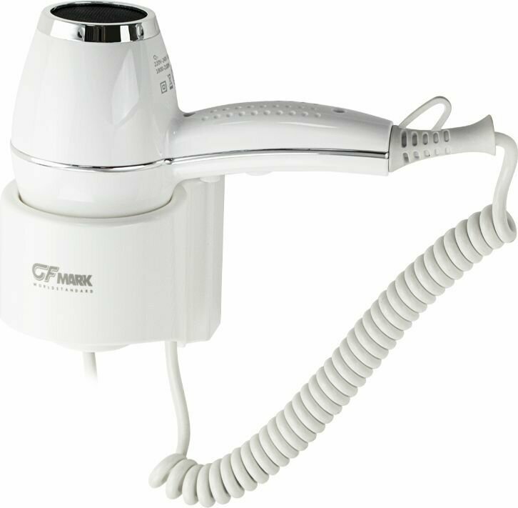 Фен для волос профессиональный, супермощный в ванную комнату с торцевым креплением, две скорости, горячий - холодный поток, . предназначен для сушки волос потоком теплого воздуха. Идеально подходит для установки в гостиницах, бассейнах, фитнес-клубах, в раздевалках складских и производственных комплексов. Так же может использоваться в личных ванных комнатах. Электрический фен позволяет комфортно и быстро высушить волосы после душа. Настенный держатель дает возможность хранить электроприбор в ванной комнате. Материал корпуса выполнен из белого высокопрочного пластика АБС , устойчивого к механическим повреждениям, перепадам температуры и коррозии. Поэтому электроприбор подходит не только для домашнего, но и для общественного использования – бассейны, сауны, душевые в спортивных залах. . Благодаря небольшому весу феном удобно пользоваться. Параметры : +65 C 1800W, 220V/50-60Hz, скорость 65 км/час, защита -IPX4, 240х205х110 мм. Габаритные размеры: высота 200 мм, ширина 280 мм, глубина 120 мм, диаметр фена 90 мм, длина шнура розетки 800 мм, длина пружинного шнура 380 - 600 мм. . Вес 1,100 кг, объем 0,00562 м3.