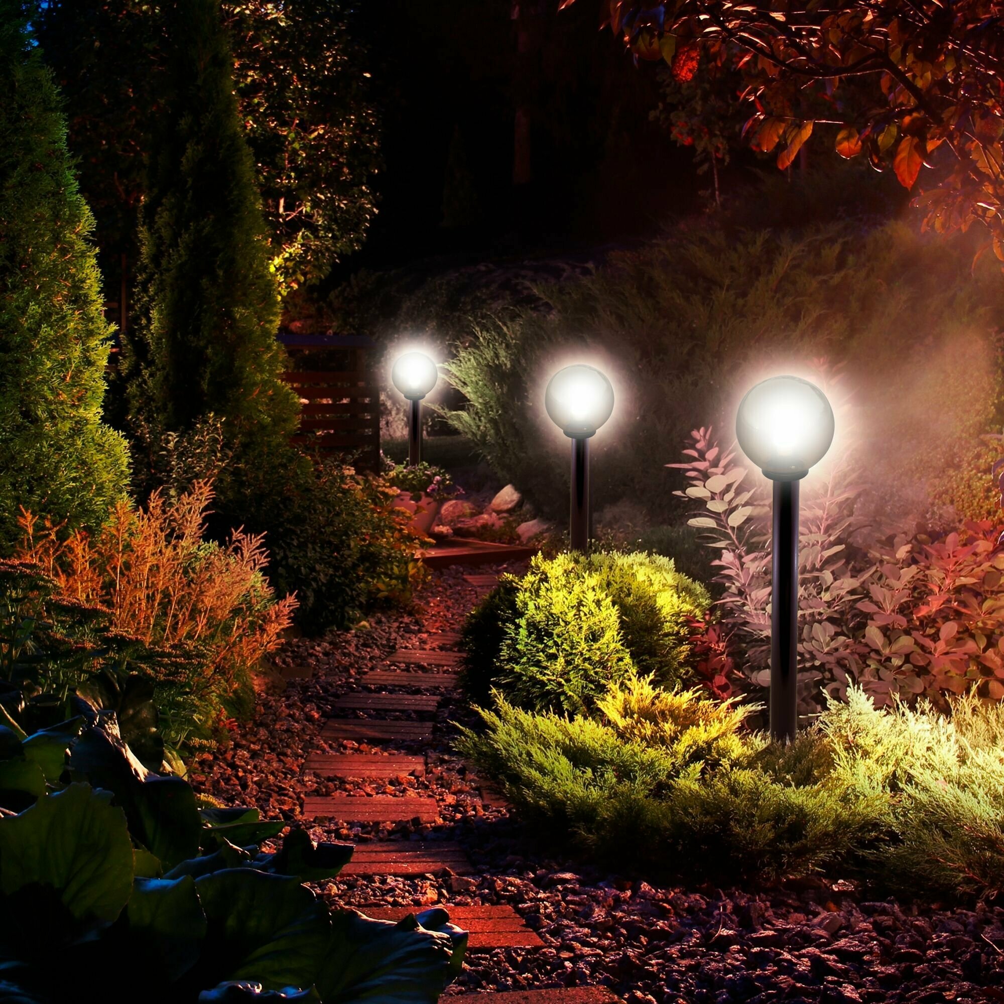 Декоративный светильник с плафоном из полиметилметакрилата выдерживает любые погодные условия и не раскалывается от резких перепадов температур. Может использоваться для освещения садово-парковых зон, а также залов кафе, ресторанов и торговых центров.