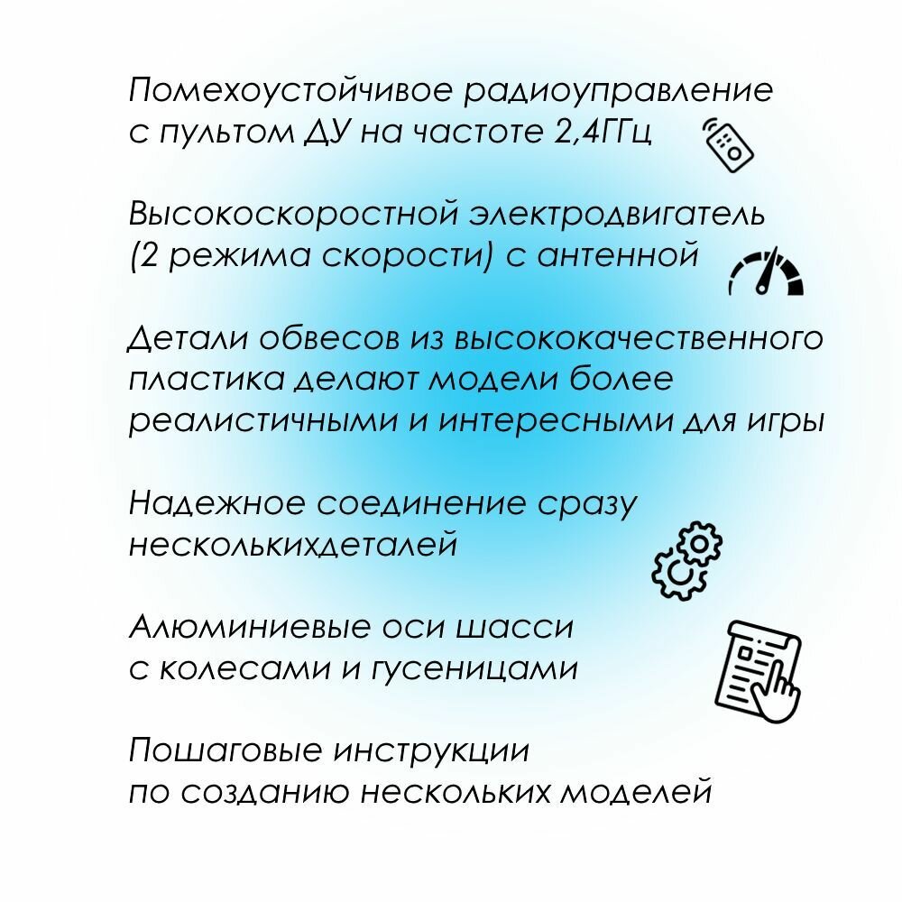 Радиоуправляемый конструктор-трансформер позволяет создавать 10 разных моделей автомобилей с электродвигателем. Модели имеют алюминиевые оси шасси с колесами и гусеницами, детали обвесов из пластика. Машины управляются с помощью дистанционного пульта.