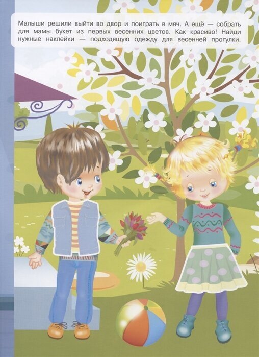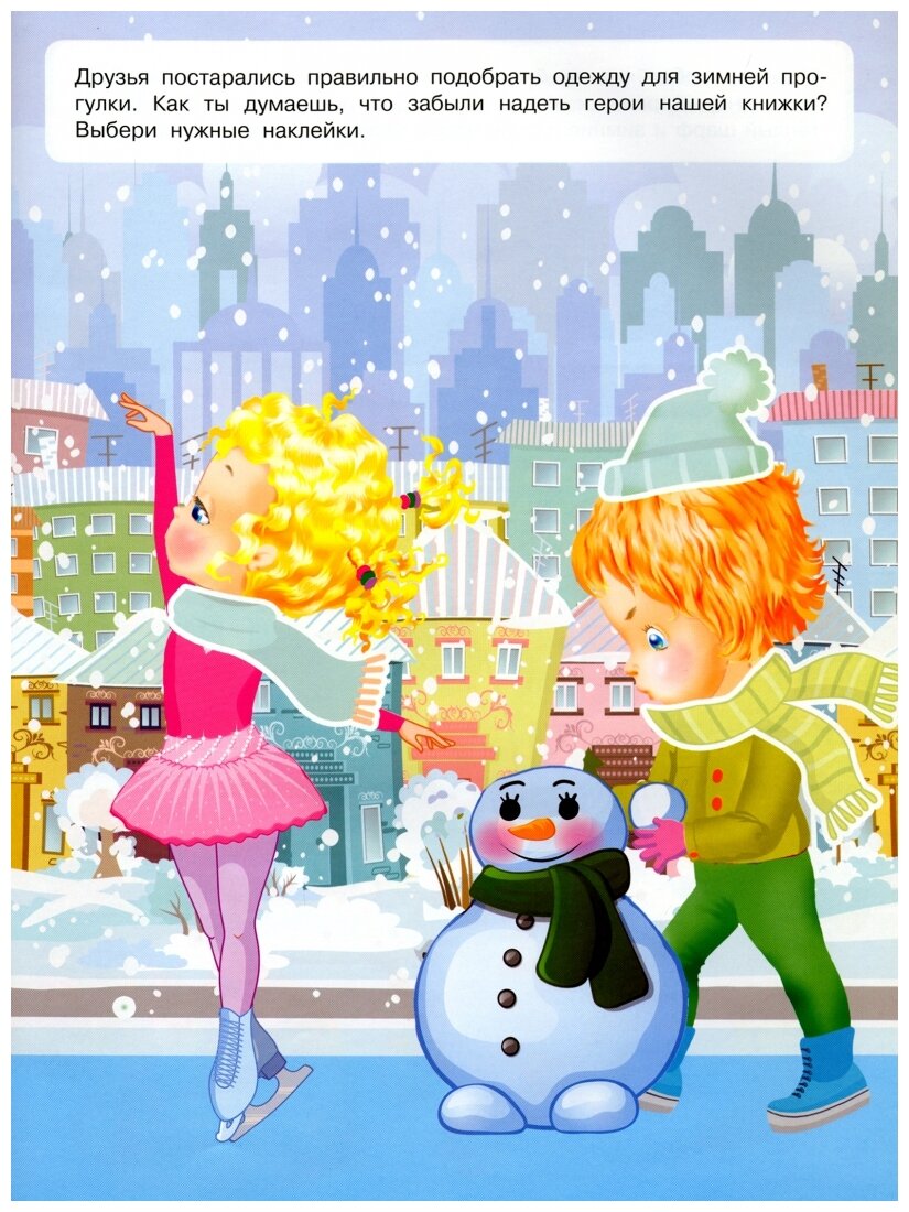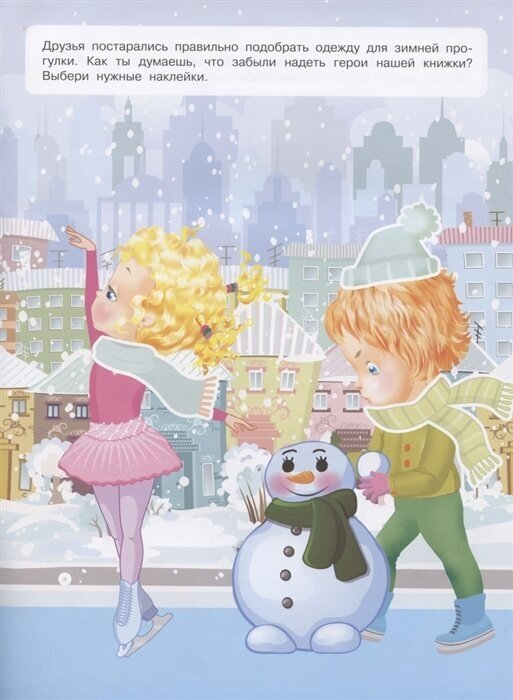 • На каждой странице — малыш Даня и его друзья, для которых нужно подобрать одежду и дополнить иллюстрации наклейками.