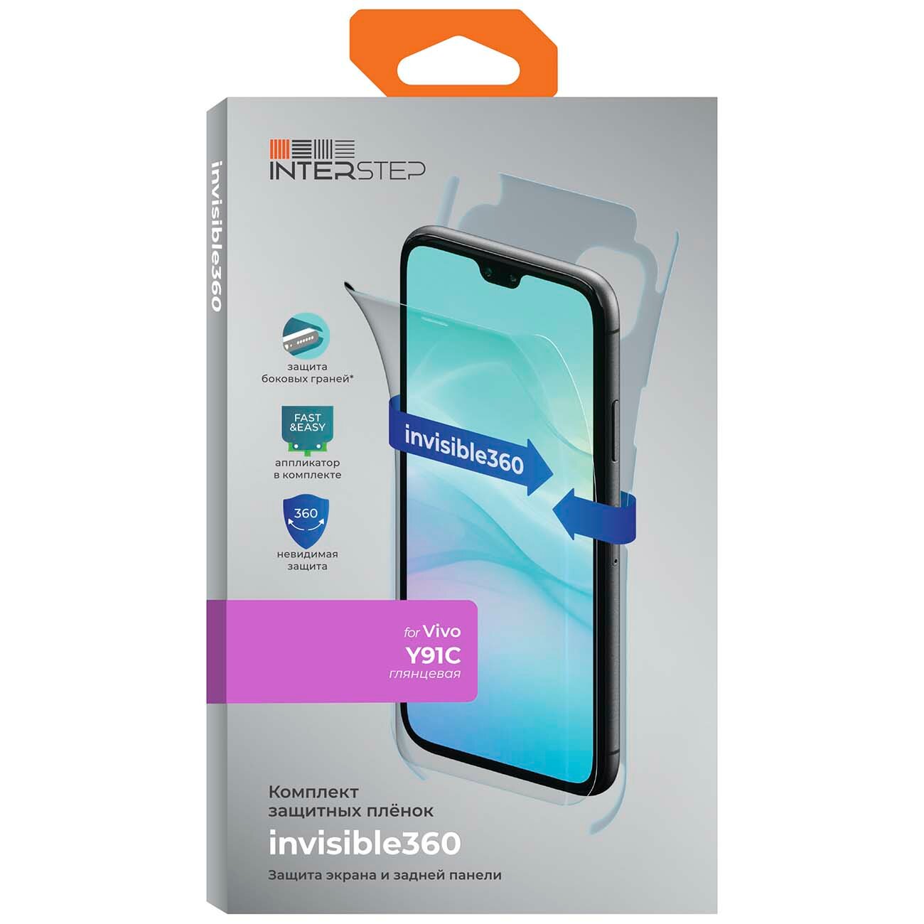 nterStep invisible360 — комплект, в состав которого входят две глянцевых защитных пленки для смартфона Vivo Y91C. Пленки изготовлены в полном соответствии с размерами и конструктивными особенностями этого девайса и прикрывают не только экран и тыльную панель, но и боковые грани.В наборе есть ракель, предназначенный для быстрой и простой установки пленки, а также салфетка для предварительной очистки поверхности от пыли. Образовавшийся защитный слой практически незаметен, не искажает изображение и не снижает чувствительность сенсорного дисплея. При этом он эффективно препятствует появлению царапин, потертостей и прочих небольших дефектов на телефоне.