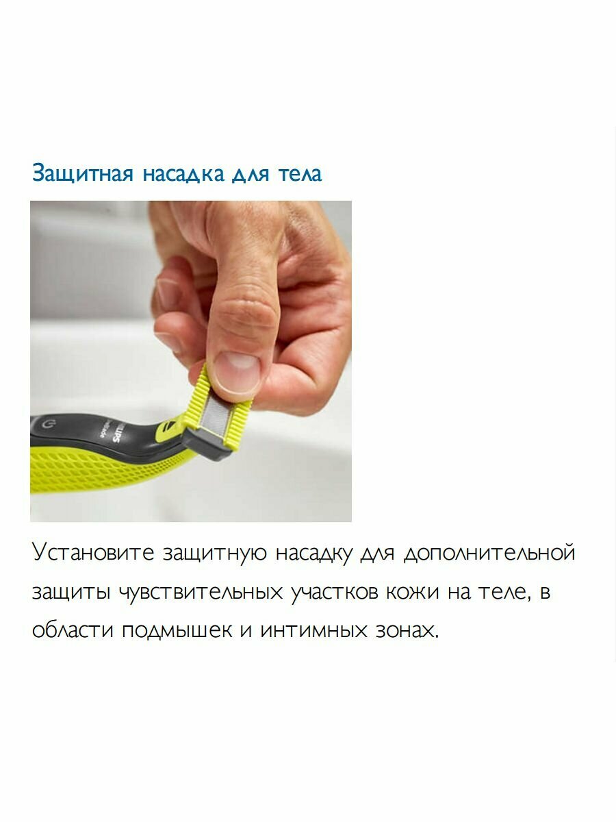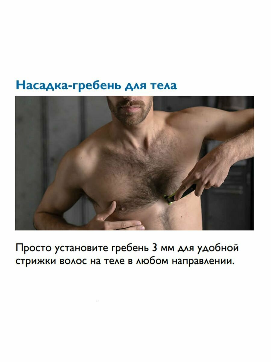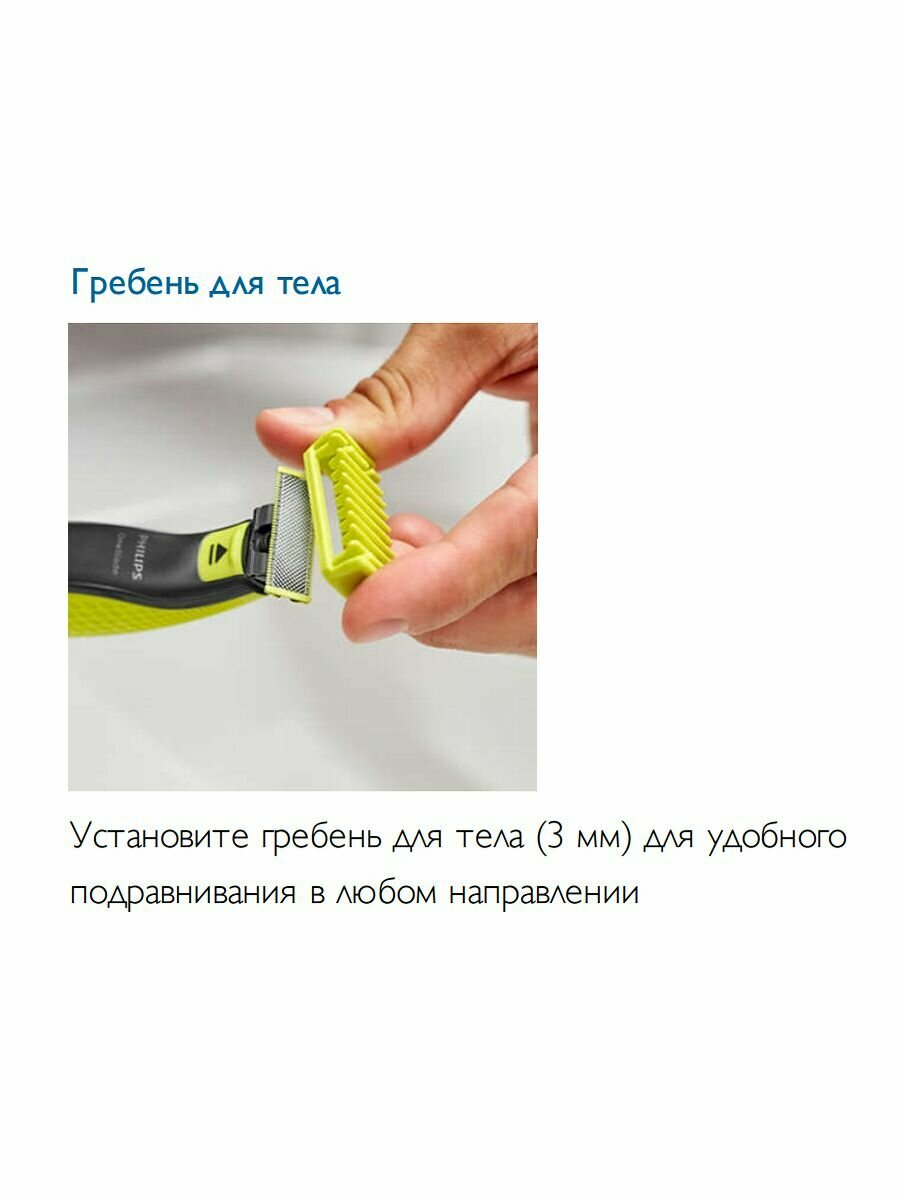 | Дополнительная информация | подравнивает, создает четкие контуры и бреет волосы любой длины; в комплект входит лезвие для лица, лезвие с защитной насадкой для тела, а также гребень для тела; забудьте об использовании нескольких устройств, ведь OneBlade умеет все |