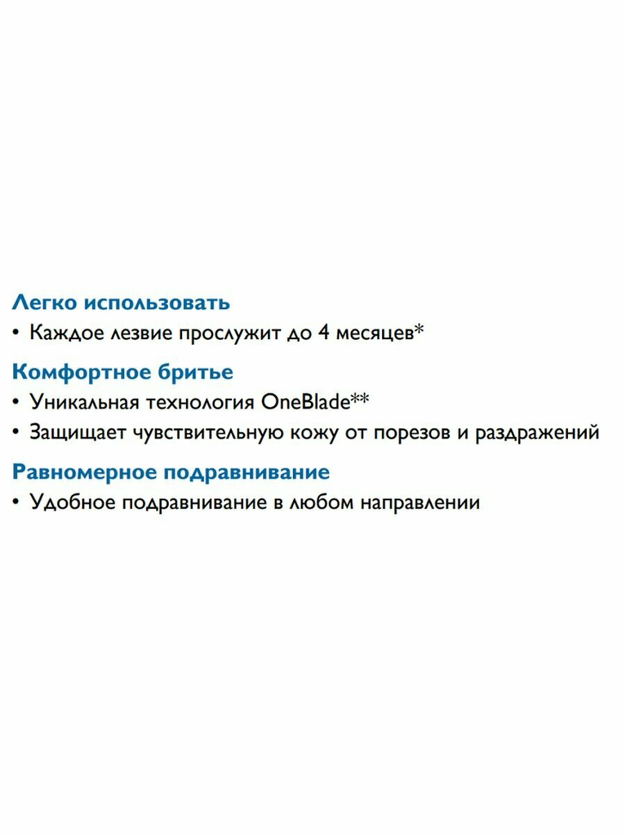 | Прочие особенности | Сменные лезвия (в упаковке) - 2, Совместимость:, OneBlade (QP25xx), OneBlade (QP26xx), OneBlade Pro (QP65xx), OneBlade Pro (QP66xx) |