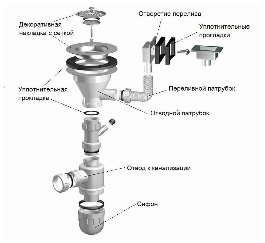 - Установка сифона с прямоугольным переливом на нержавеющую мойку