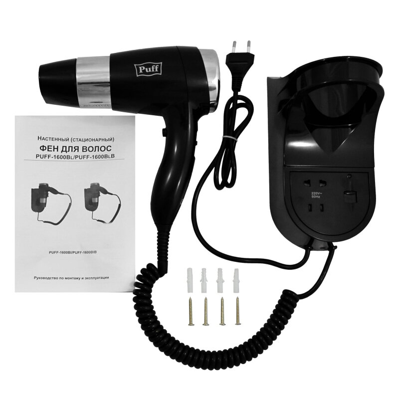 Фен для волос настенный \"Puff-1600В\", белый, 1,6 кВт, с розеткой.