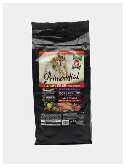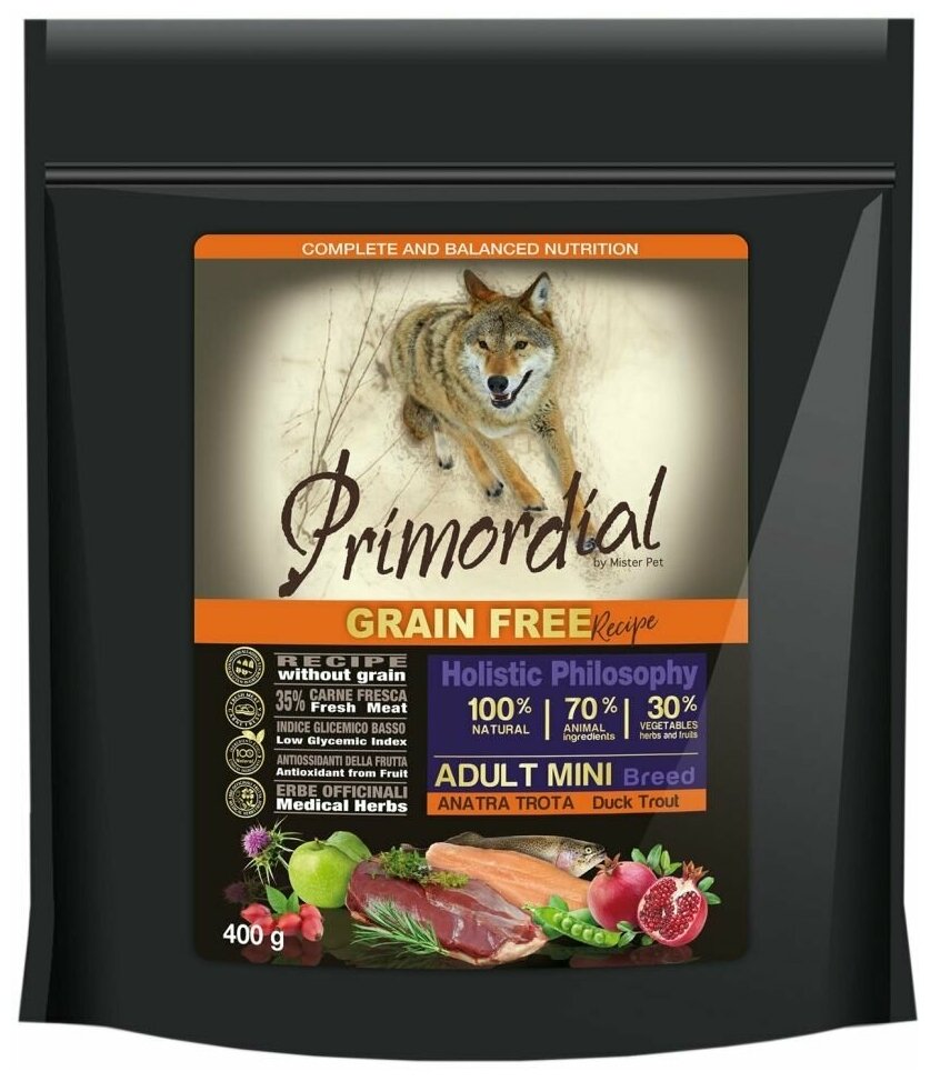 Сервис сравнения цен СкидкаГИД предлагает сравнить цены на товар «Сухой корм для собак Primordial беззерновой с форелью и уткой для маленьких пород 04 кг»
