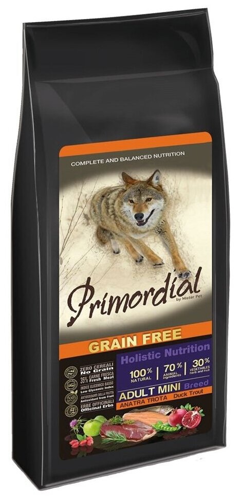 Корма произведены в Италии. Корм Примордиал с форелью и уткой является полноценным и сбалансированным кормом собак маленьких пород. Вашему питомцу понравится корм Примордиал.