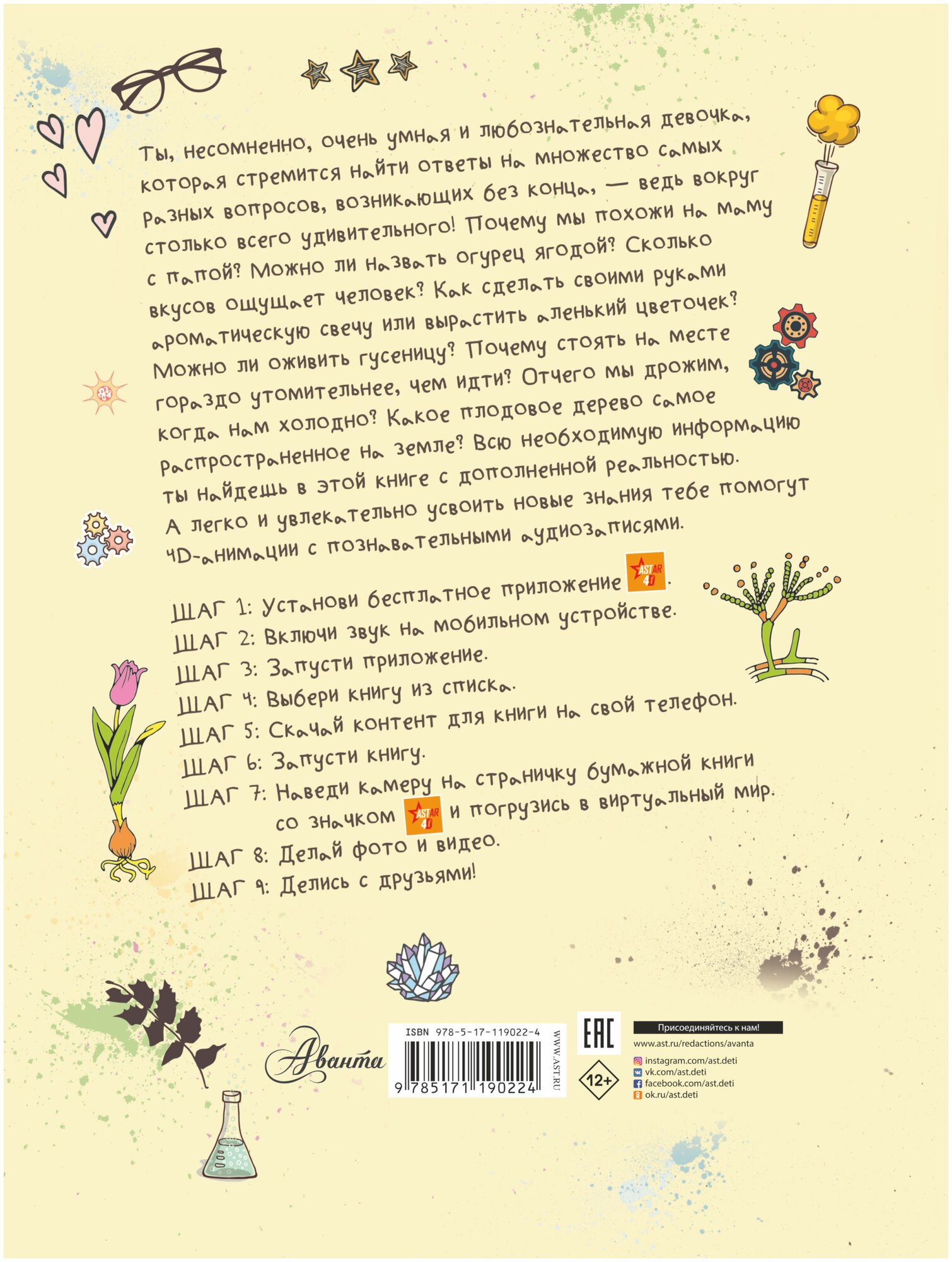 Ты хочешь знать, как на нашей планете появилась жизнь? Какие животные обитают на ней? Как устроен каждый человек на Земле? Сколько у нас костей, мышц и волос? А может, ты хочешь вырастить аленький цветочек или сделать ароматическую свечку своими руками? Прочитав эту книгу, ты узнаешь множество интересной и полезной информации обо всех живых существах нашей планеты, изучишь строение и функции человеческого организма и сможешь удивлять всех подруг забавными и познавательными экспериментами. А дополненная 4D-реальность в виде объемных анимаций, снабженных информативными аудиозаписям, поможет запомнить даже самые сложные факты быстро, легко и весело.