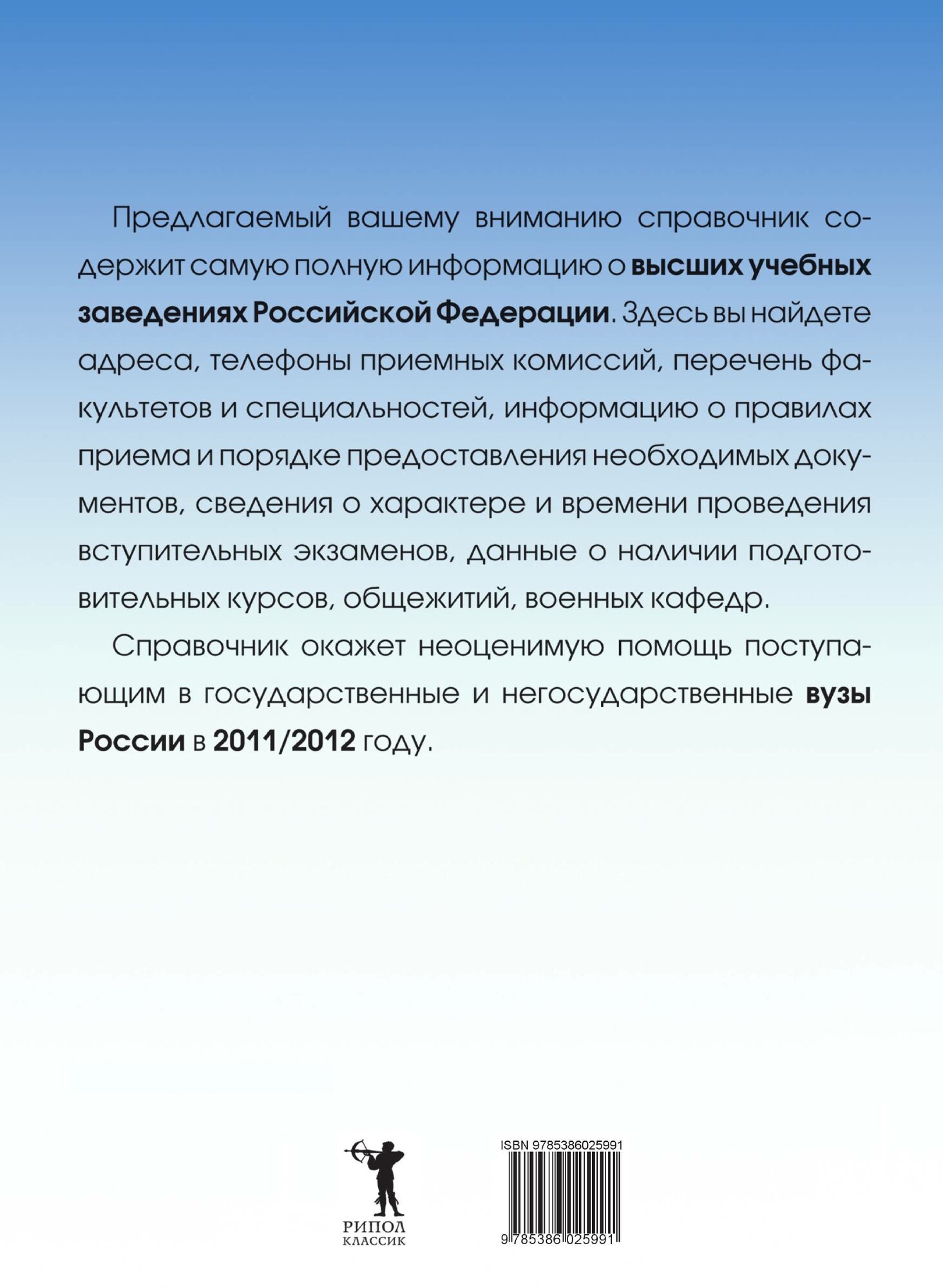 Предлагаемый вашему вниманию справочник содержит самую полную информацию о высших учебных заведениях Российской Федерации. Здесь вы найдете адреса, телефоны приемных комиссий, перечень факультетов и специальностей, информацию о правилах приемах и порядке предоставления необходимых документов, сведения о характере и времени проведения вступительных экзаменов, данные о наличии подготовительных курсов, общежитий, военных кафедр. Справочник окажет неоценимую помощь поступающим в государственные и негосударственные вузы России в 2011/2012 году.