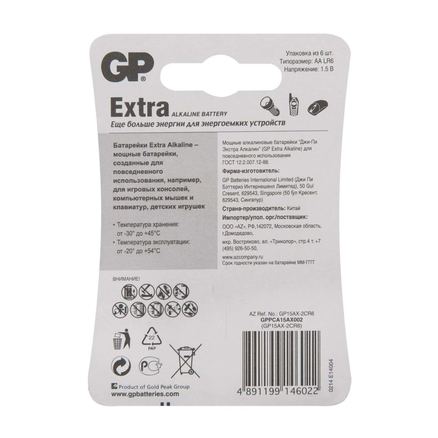 Модель: Extra Alkaline AA (LR6), 6 шт (GP15AXNEW-CR6)