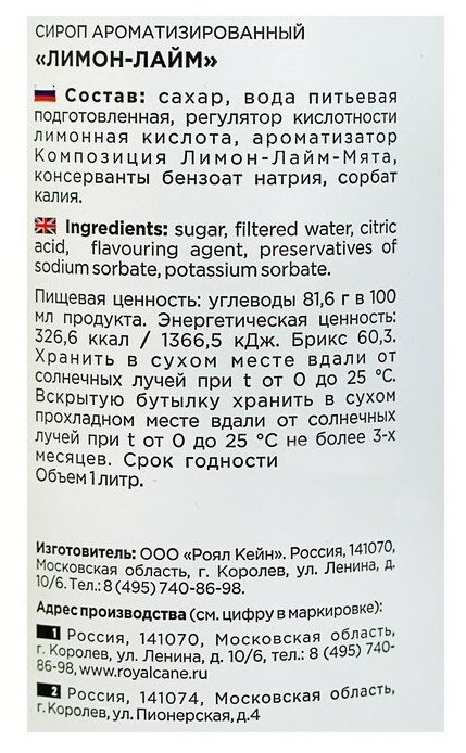 | Состав | сахар, вода питьевая подготовленная, регулятор кислотности лимонная кислота, ароматизатор Композиция Лимон-Лайм-Мята, консерванты бензоат натрия, сорбат калия |