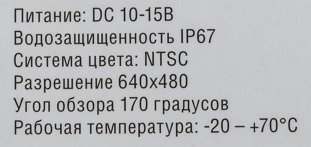| Прочие особенности | Изображение цветное Разрешение камеры 640x480 Камера заднего вида Digma DCV-110 позволит увереннее чувствовать себя водителям, совершающим парковку, особенно в узких местах, очень актуально для больших городов. Широкий угол обзора 170 градусов поможет лучше увидеть все, что происходит снаружи автомобиля. |