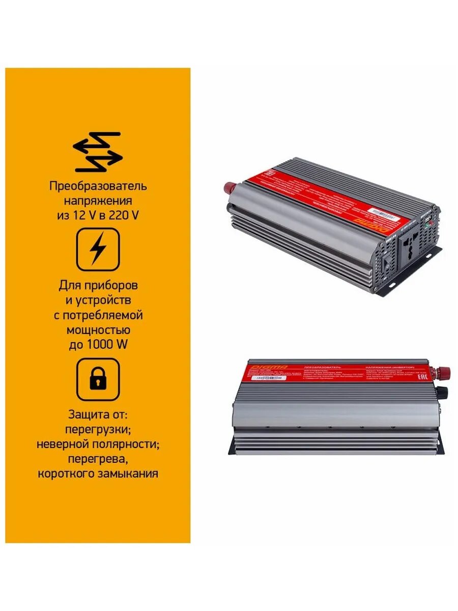 | Особенности | Кратковременная пиковая мощность:2000 Вт Защита от неправильной полярности |
