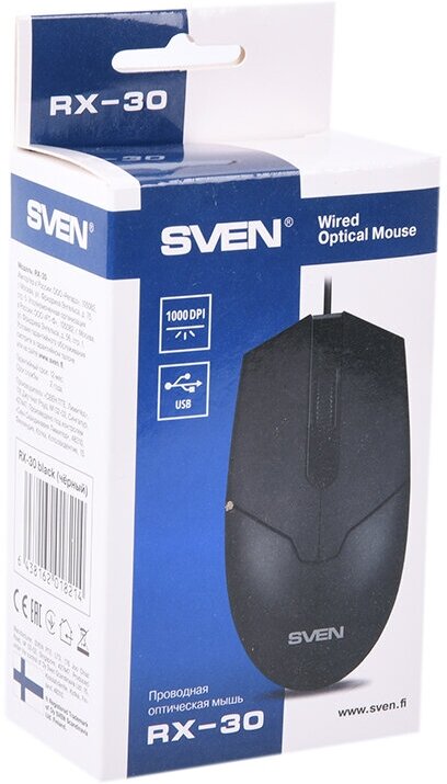 Мышь SVEN RX-30 USB чёрная 2+1кл. 1000DPI цвет. картон каб. 2м.