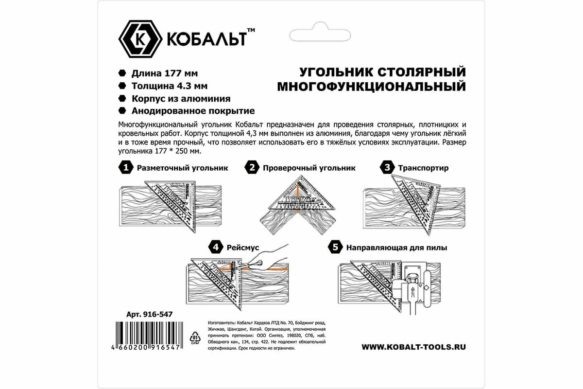 Бренд: Кобальт; Модель: столярный; Тип: Угольник; Размер: 30 см; Материал изготовления: нержавеющая сталь; Цвет: серебристый; Дополнительно: Столярный угольник 300мм, нерж.сталь, чугунное основание КОБАЛЬТ 243-424 представляет собой прочный и долговечный в эксплуатации измерительный инструмент, который предназначен для проведения линейных замеров, разметки и выверки углов под 90 градусов. Изделие широко используется при сборочных работах. Полотно оснащено отверстием для возможности хранения в подвесном виде на стене или верстаке.