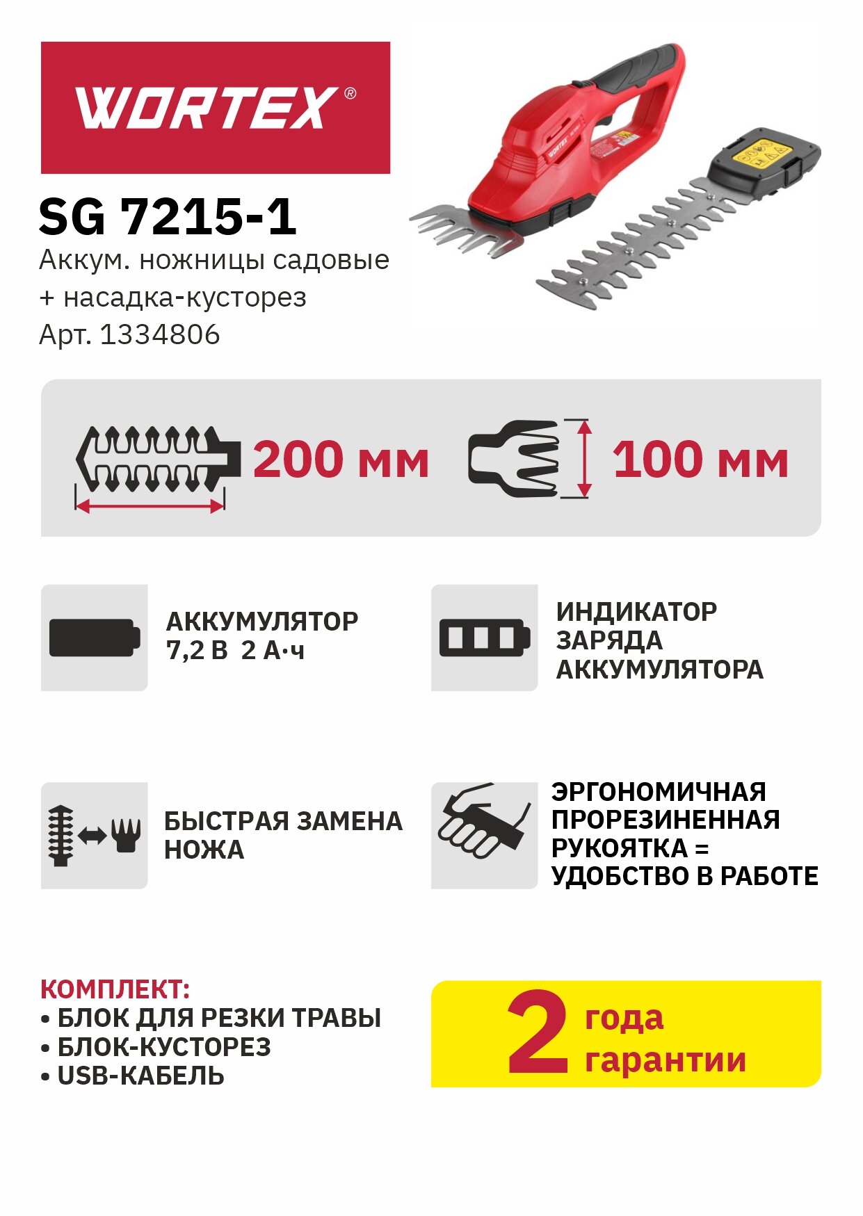 - WORTEX SG 7215 Аккумуляторные ножницы садовые насадка кусторез