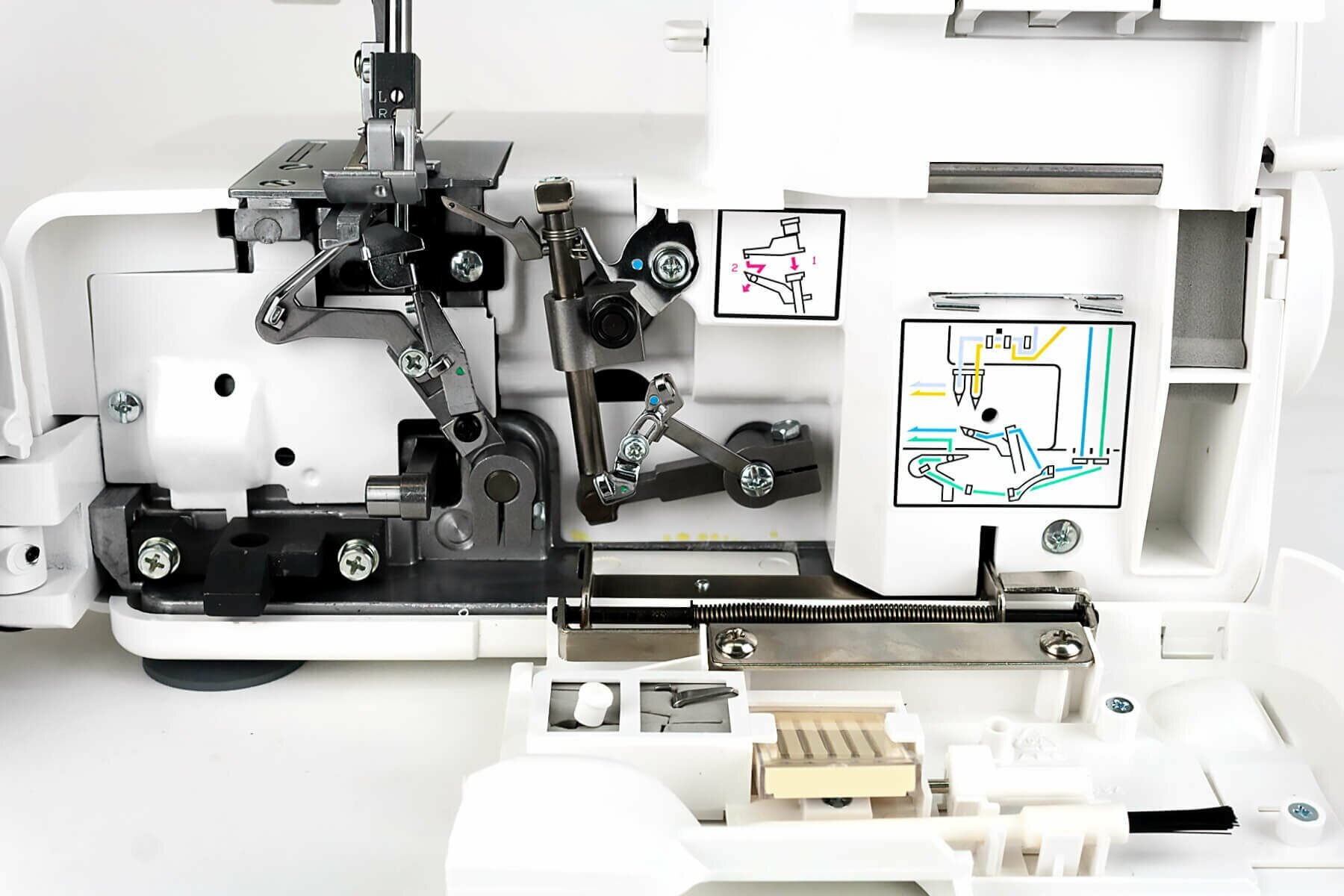 Прибор оснащен стандартными иглами ELx705 с увеличенным размером ушка. Это позволяет легко заправлять нить и предотвращает ее запутывание. Максимальная скорость шитья составляет 1300 стежков в минуту.