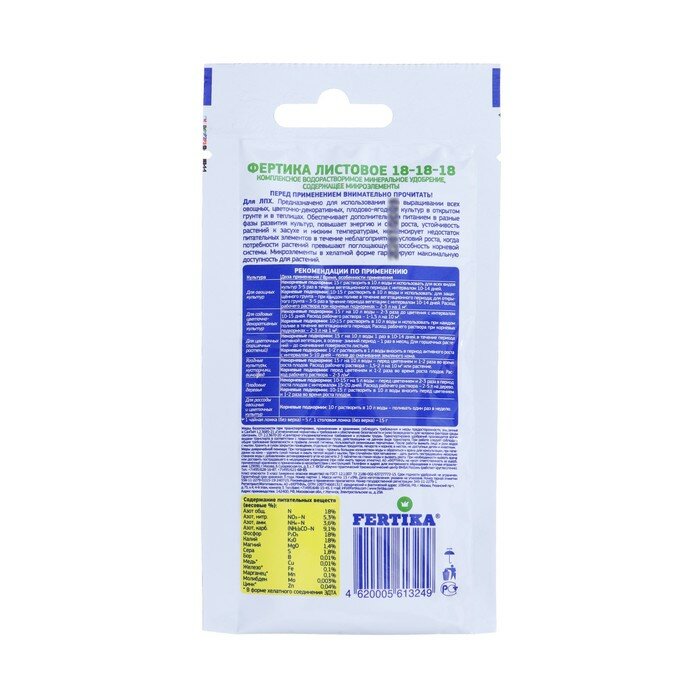 Полностью водорастворимое комплексное удобрение (NPK 18:18:18 + 1,4 MgO+МИКРОЭЛЕМЕНТЫ). Предназначено для использования при выращивании всех овощных, цветочно-декоративных, плодово-ягодных культур в открытом грунте и в теплицах. Микроэлементы.