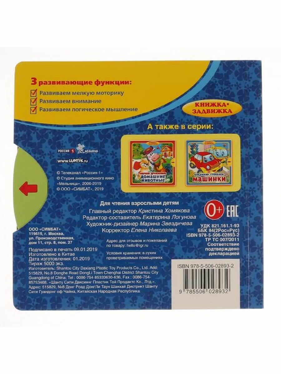 В книжке представлена интересная история про персонажей из мультсериала. На каждом развороте малыша ждёт задание – загадка. Ребёнок будет с удовольствием отвечать на вопросы, а чтобы узнать ответ, достаточно потянуть задвижку, и появится правильная картинка.