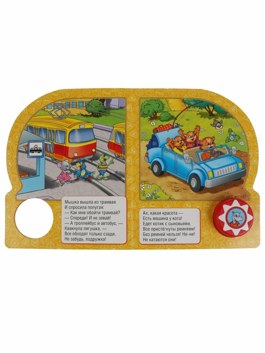 Добрые стихи о транспорте и правилах дорожного движения, песенки и красочные иллюстрации расширят кругозор ребёнка и сделают обучение чтению увлекательным занятием. Малыш будет с удовольствием рассматривать картинки, читать, слушать песню и подпевать. Нажми на кнопку и услышишь песенку, повторное нажатие её отключит. Композиции исполняются профессиональными артистами. Книжка сделана из плотного картона, поэтому родители могут не опасаться за её сохранность. Благодаря компактному формату её удобно взять с собой в дорогу.