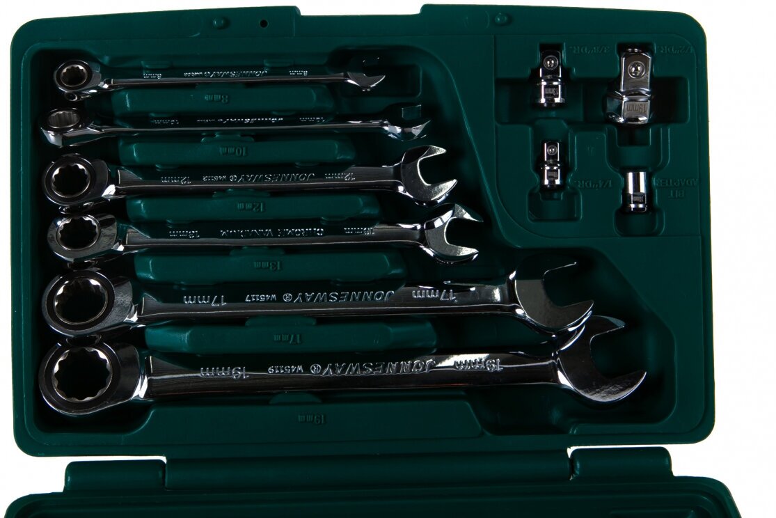 Набор комбинированных трещоточных ключей Jonnesway используется в автомастерских при ремонте различных транспортных средств. Инструменты расположены в специальных углублений для удобной транспортировки набора.
