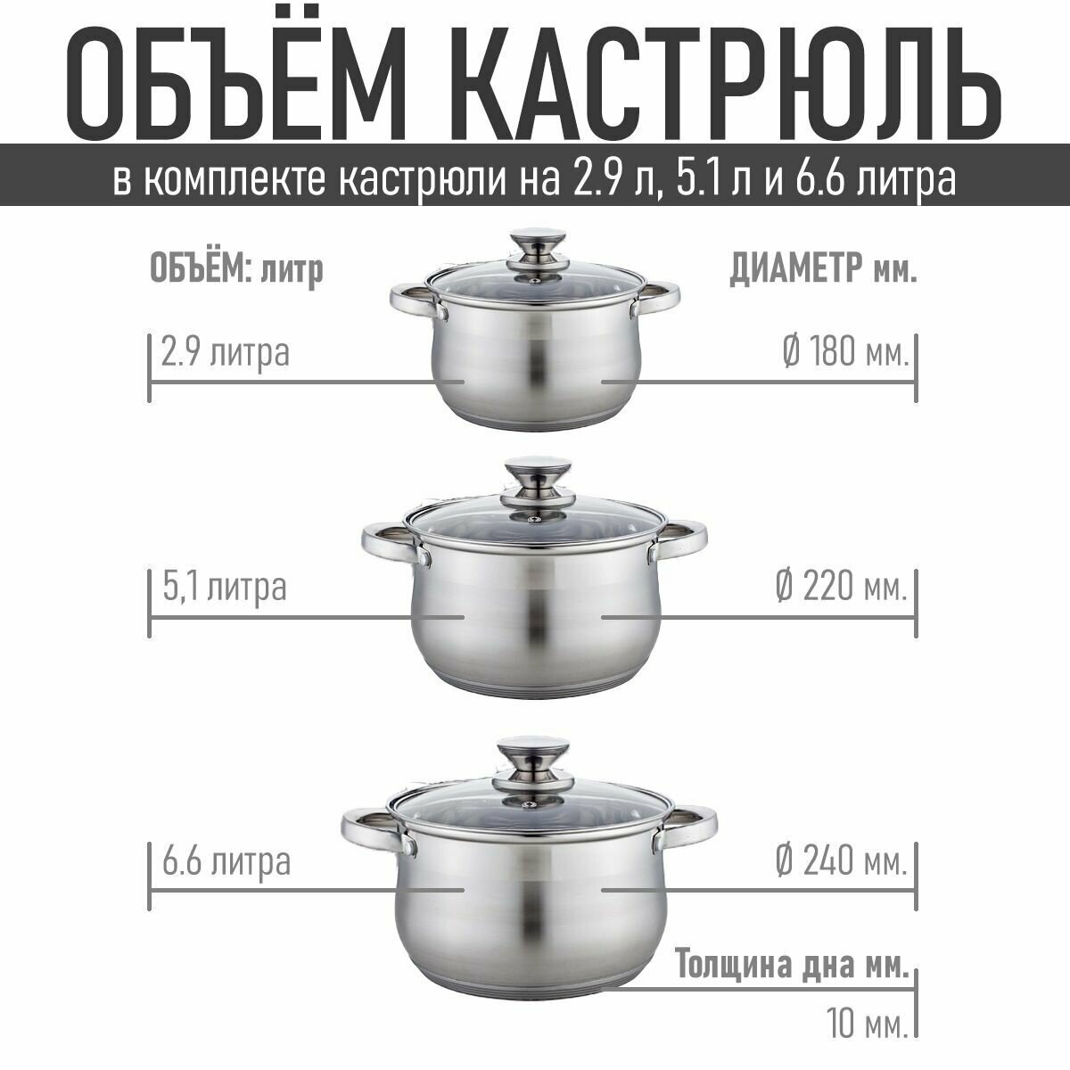 | Объем кастрюли | 2.9/ 5.1/ 6.6 л |
