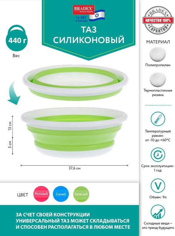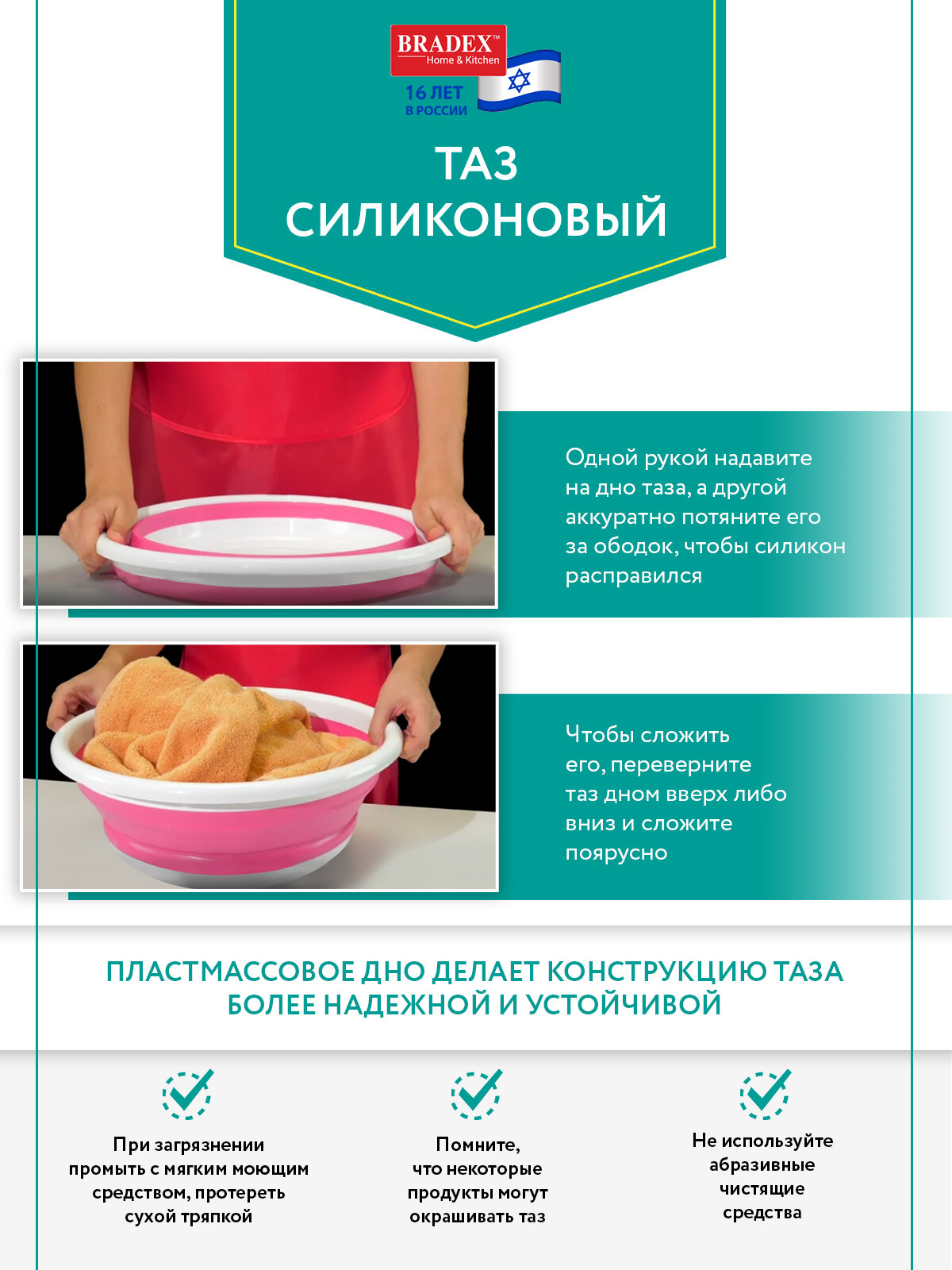 Складной силиконовый таз. За счет своей конструкции таз может складываться и способен располагаться в любом месте. В сложенном виде поместится в шкафу, багажнике автомобиля, на балконе, на даче, на полке в подсобке. Материал не токсичен, вы можете использовать таз не только для стирки, уборки, но и для переноски пищевых продуктов, в том числе для сбора урожая.