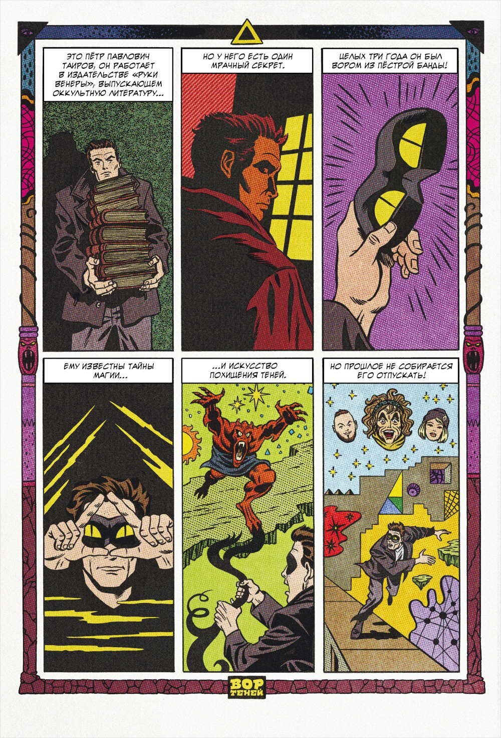 Сумашедший третий выпуск комикса "Вор Теней" передом мной! Итак, сразу хочу сказать об общей атмосфере постмодернизма: она зашкаливает. Столько мистики, психоза, весёлых похождений, и мистико-судебных интриг вы не найдёте нигде, кроме как в "Воре Теней". Про что это выпуск? Про то, как Нумероуно (атаман Пёстрой банды, и начальник вора теней) сдаёт воришку под суд, чтобы тот образумелся, и решил вернуться в банду. Всё гениальное просто