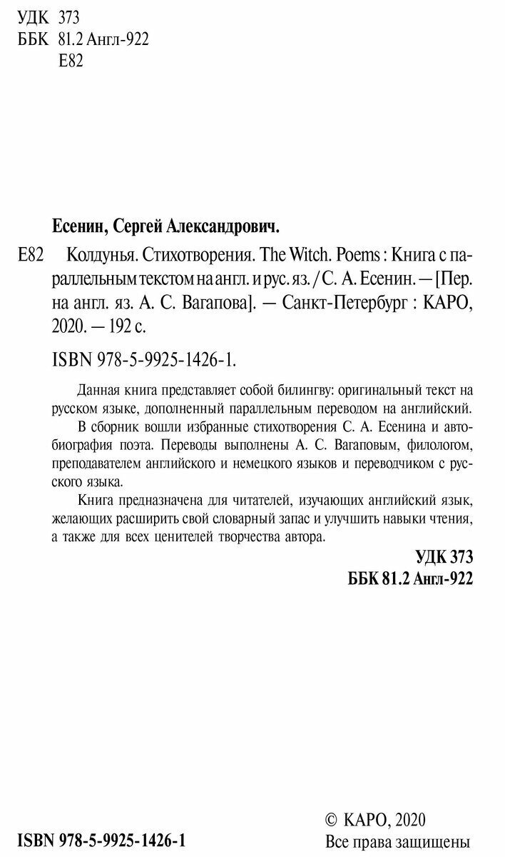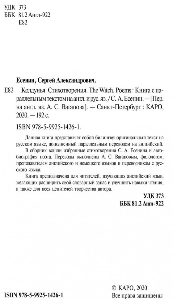 Сервис сравнения цен СкидкаГИД предлагает сравнить цены на товар «Книга: Колдунья. Стихотворения. Билингва (на английском и русском языке) (Сергей Александрович Есенин); КАРО, 2020»