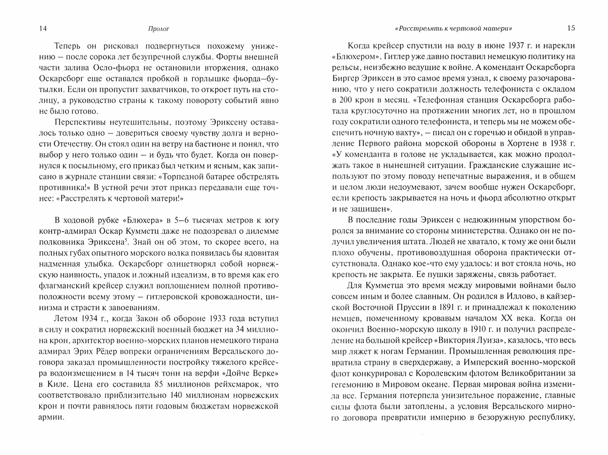 Интересная книга. В русскоязычной литературе по этой теме информации немного. Много свидетельств очевидцев, но мало информации по чисто военным вопросам -нет целостной картины по силам норвежцев (ВМФ, ВВС, береговая оборона, армия) в районе Осло-фьорда. Хорошее качество издания.