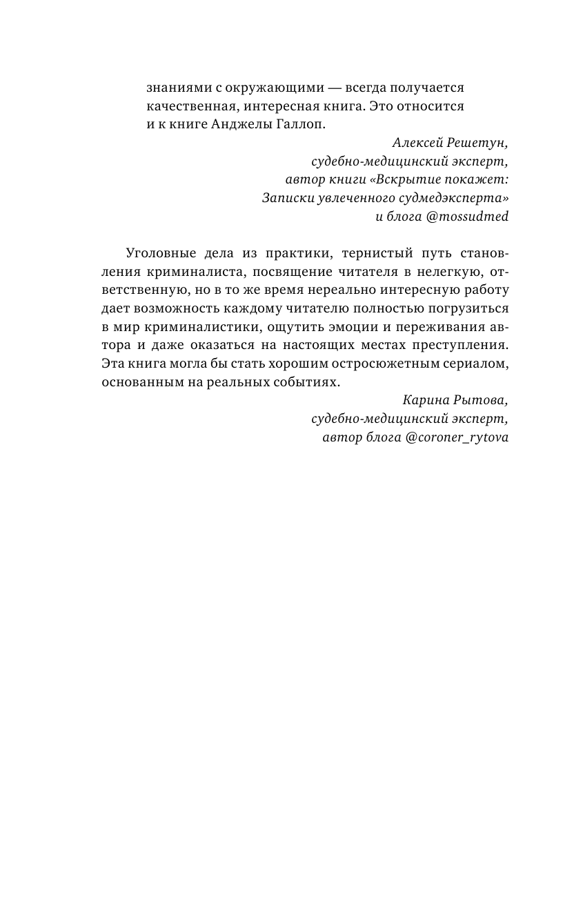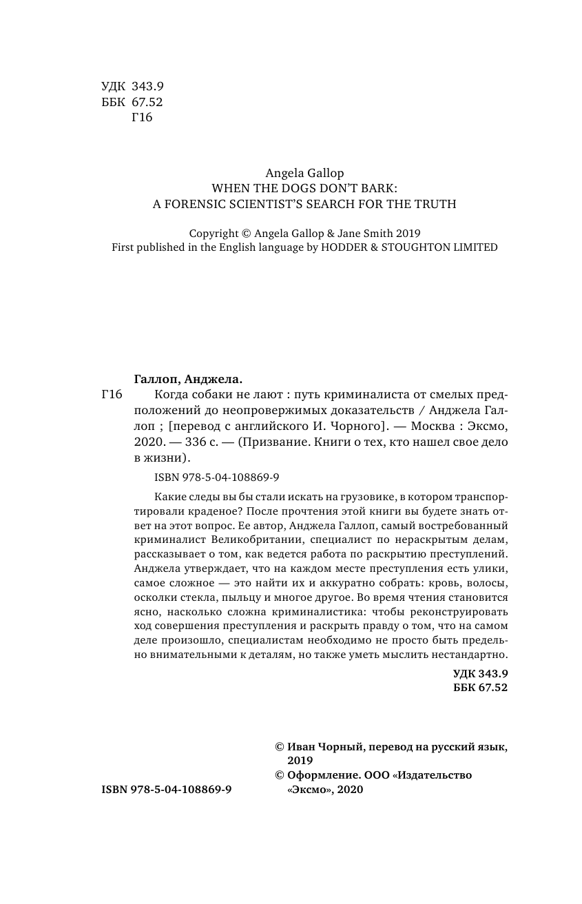Когда преступление совершено, остается только безмолвная жертва, ее личные вещи и место, хранящее следы преступника. С этого момента начинается работа криминалиста: собрать все улики, проанализировать их, провести нужные тесты, попытаться понять мотив. Книга Анджелы Галлоп погружает читателя в мир вещественных доказательств и самых страшных и странных человеческих поступков. Будучи специалистом по нераскрытым делам, она рассказывает, как происходит расследование, зачем эксперты аккуратно изучают даже мельчайшие ворсинки с места преступления. Во время своей работы Анджела многое узнала как о криминалистике и ее методах, так и о самих людях, о том, насколько тесно любое преступление связано с эмоциями. В книге "Когда собаки не лают" есть и описание громких дел, и сложные социальные сюжеты, и история становления самого востребованного криминалиста Великобритании. Анджела Галлоп посвятила криминалистики более 45 лет и в своей книге постаралась максимально полно и интересно рассказать обо всех сторонах этой непростой профессии.