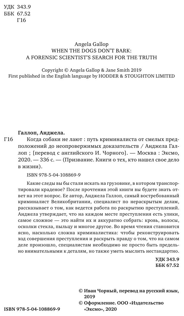 Когда собаки не лают: путь криминалиста от смелых предположений до неопровержимых доказательств (Галлоп Анджела); ООО "Издательство "Эксмо", 2020