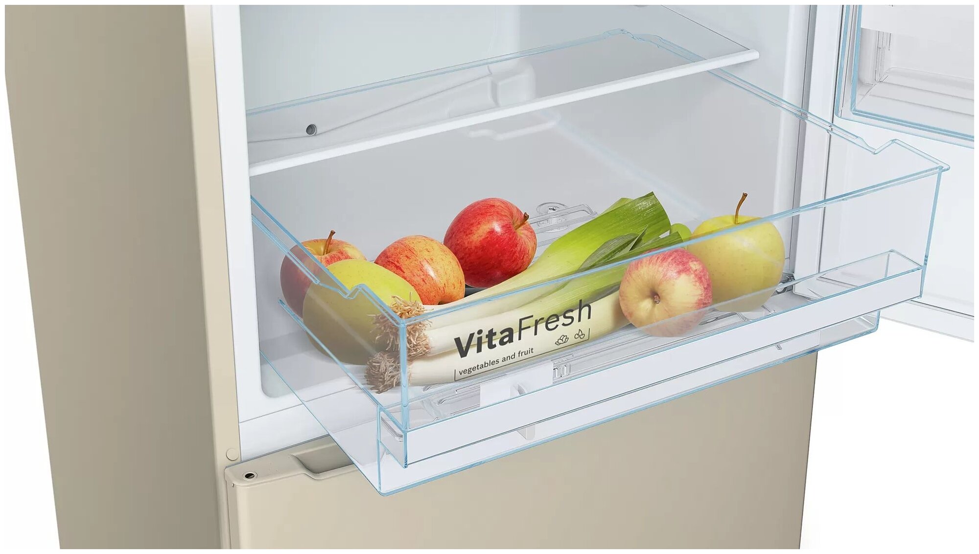 Холодильник имеет привлекательный бежевый цветовой оттенок, который добавит изысканности вашей кухне. Также он отличается высокой энергоэффективностью класса A+, что поможет сэкономить электроэнергию и деньги на ежемесячных платежах за электричество.