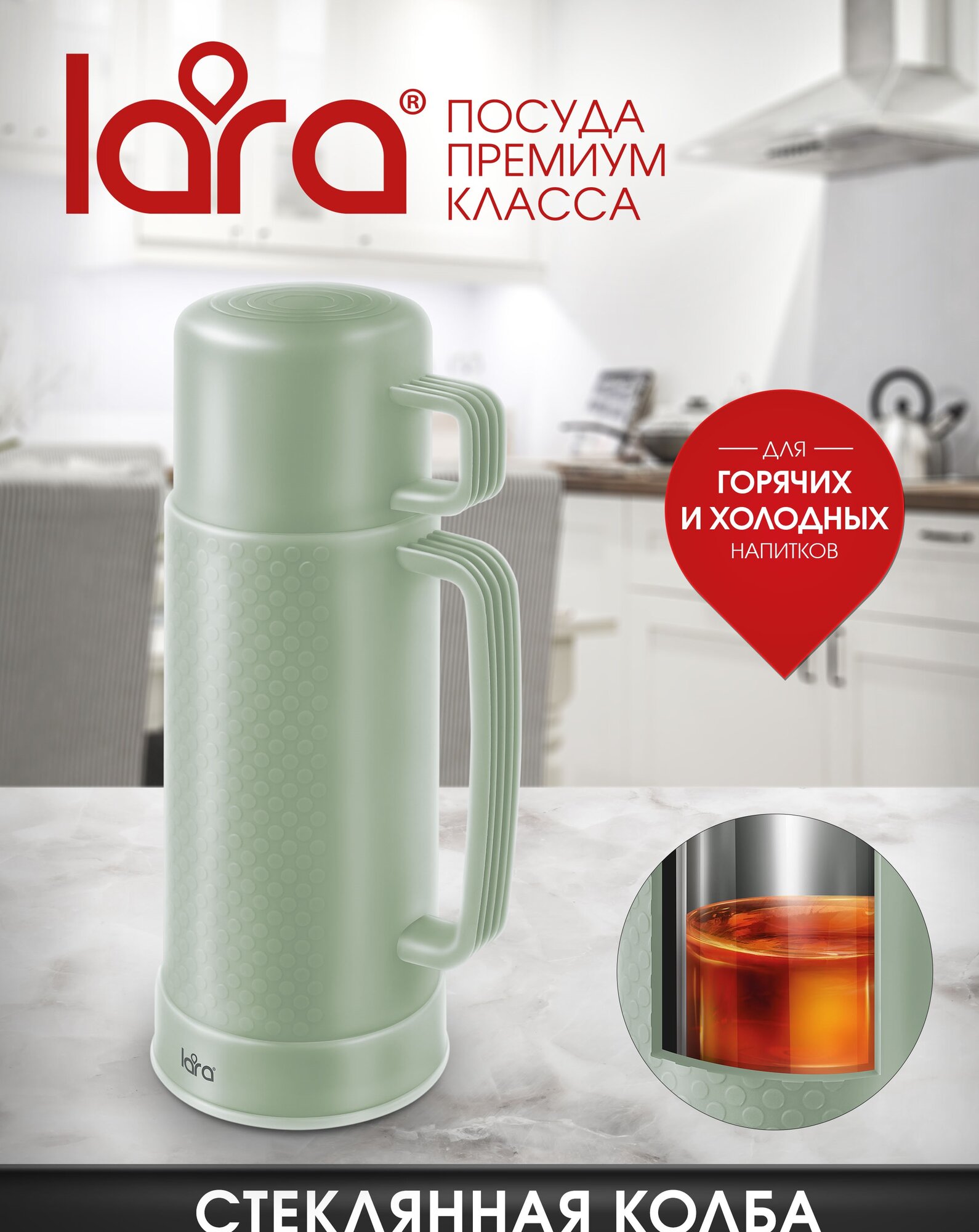 Термос Green торговой марки Lara. Эргономичный термос LARA с двойными стенками для длительного поддержания температуры. Колба изготовлена из стекла с зеркальным покрытием, корпус выполнен из полипропилена. Стеклянные термосы славятся своими свойствами - этот материал не впитывает запахи и вкусы, легко очищается. Стекло обладает на 30 % меньшей теплопроводностью, чем металл, поэтому настолько же дольше сохраняет температуру. Термос имеет не просто крышку-кружку, а кружку с ручкой, что выгодно отличает его от других моделей. Горлышко закупоривается завинчивающейся пробкой с клапаном. Данная модель представлена в двух цветах. Объем - 1,0 л;