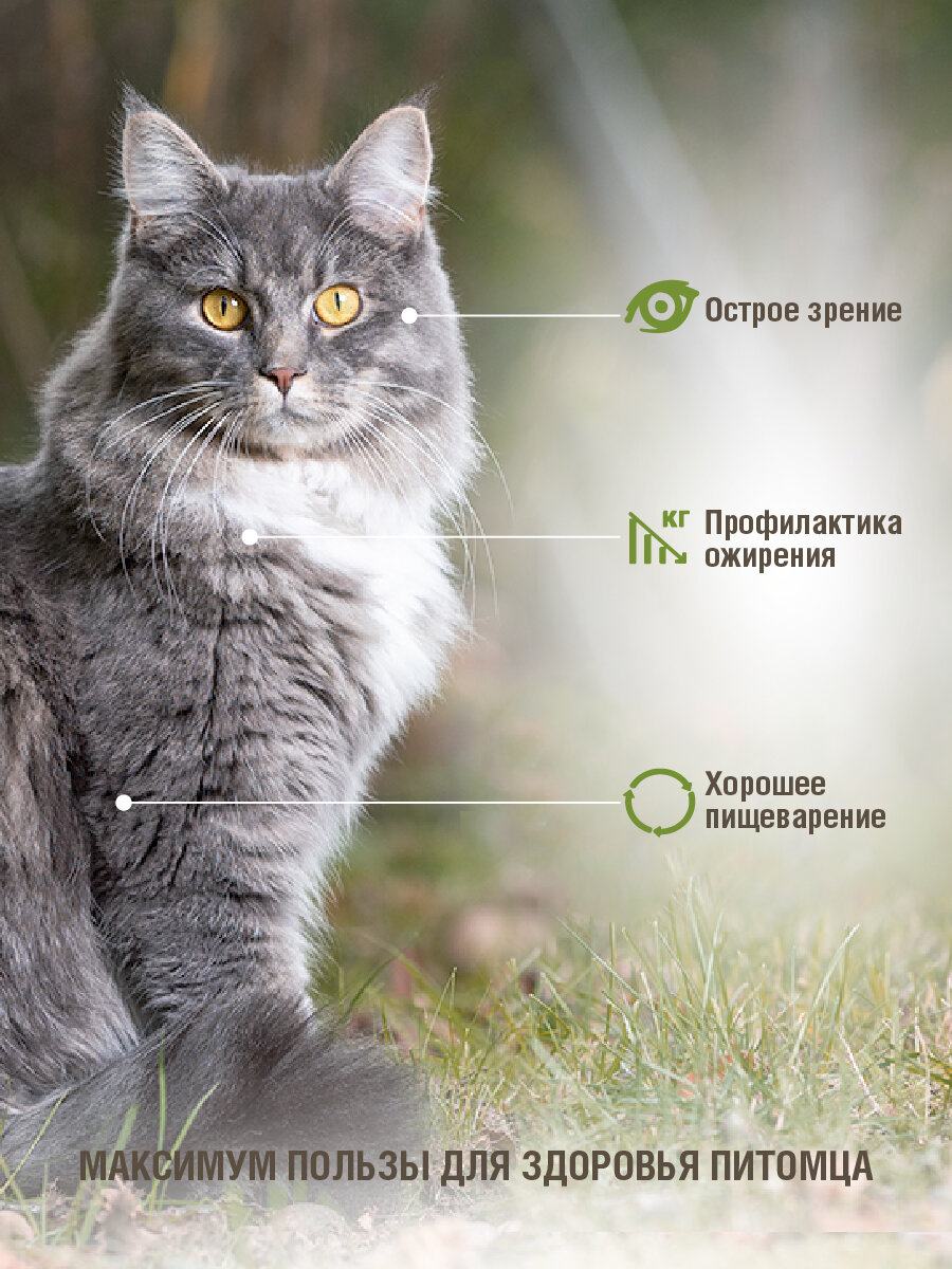 Высокоусвояемые питательные вещества и специально подобранная клетчатка способствует правильной работе кишечника. Блестящая шерсть и здоровая кожа. Сбалансированное содержание Омега-3 и Омега-6 ненасыщенный жирных кислот обеспечивают здоровую кожу и блестящую мягкую шерсть. Дополнительный источник влаги - Профилактика образования уролитов. Достаточное содержание аминокислот — слабокислый рН.