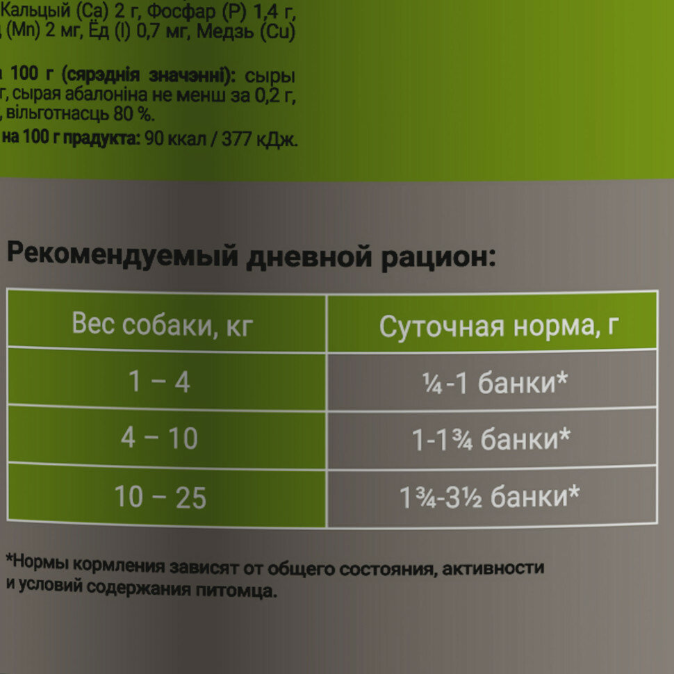 Пищевая ценность: сырой белок 10,0%, сырой жир 4,0%, сырая клетчатка 0,2%, сырая зола 3,0%, влажность 80%, кальций 1,1%, фосфор 0,8%.