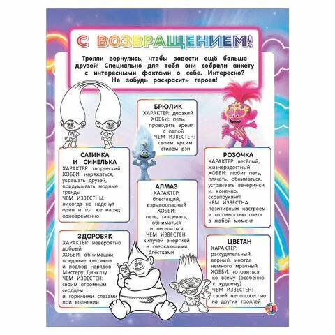 Неплохая вещь для любителей троллей,порадовали яркие иллюстрации,ходилка, для моего ребенка она является определяющим звеном в выборе, разнообразие заданий,и раскраска,в том числе и по цифрам,и отличия,и "поисковички",и многое другое, и конечно же наклейки. Единственное,что немного разочаровало, в начале есть имена и описание троллей,но не всех,а всего 6, для тех кто как мы только открывает мир полюбившихся персонажей,маловато.