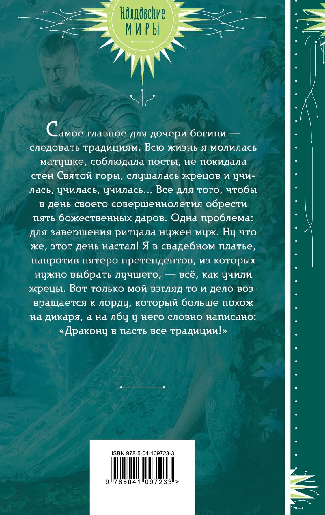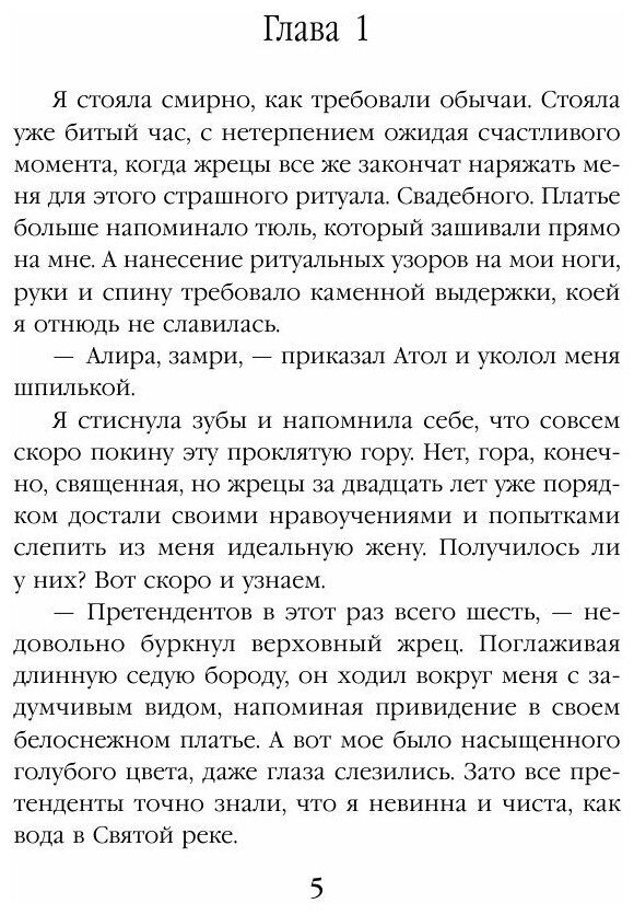 Самое главное для дочери богини - следовать традициям. Всю жизнь я молилась матушке, соблюдала посты, не покидала стен Святой горы, слушалась жрецов и училась, училась, училась... Все для того, чтобы в день своего совершеннолетия обрести пять божественных даров. Одна проблема: для завершения ритуала нужен муж. Ну что же, этот день настал! Я в свадебном платье, напротив пятеро претендентов, из которых нужно выбрать лучшего, - все, как учили жрецы. Вот только мой взгляд то и дело возвращается к лорду, который больше похож на дикаря, а на лбу у него словно написано: "Дракону в пасть все традиции!"
