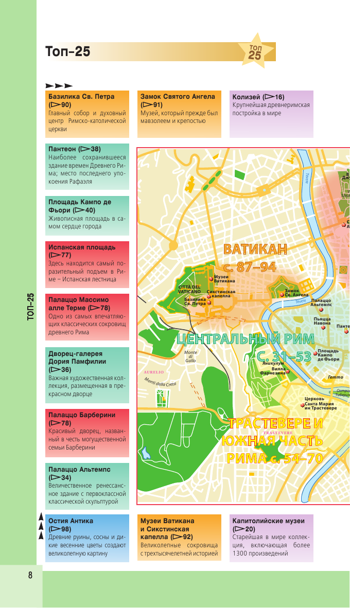 Карта, которая есть в конце этих путеводителей, по моему опыту недостаточно точна. Встречаются расхождение в названиях улиц, бывает сложно сориентироваться на месте, к тому же она охватывает только центр. Лучше купить карту города на месте, а этой пользоваться при составлении планов прогулок.