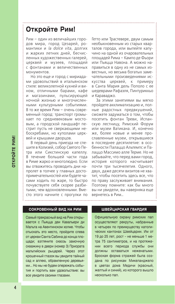 Перед вами обновленный экспресс-гид по Риму. В нем содержится краткая информация о столице, советы, как лучше провести первый и второй дни, и 25 главных достопримечательностей. Также в книге вы найдете описания самых интересных мест каждого района города. Гуляйте, знакомьтесь, восхищайтесь вечным городом и получайте нужную информацию в режиме нон-стоп!